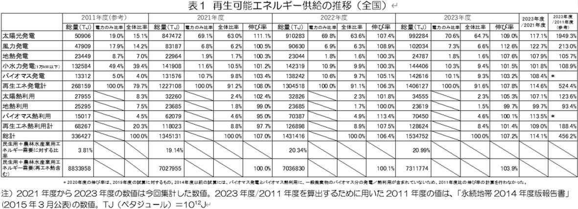 2023年度は前年度に引き続き風力発電の伸び率(12.6%増)が太陽光発電の伸び率(9.0%増)を上回りました。これらに牽引され再生可能エネルギー電力は対前年度で7.8%増加しました。固定価格買取制度の対象外である、再生可能エネルギー熱供給は1.4%の増加にとどまりました。再生可能エネルギーの供給量は2011年度に比べて2023年度は約4.5倍になりました。
