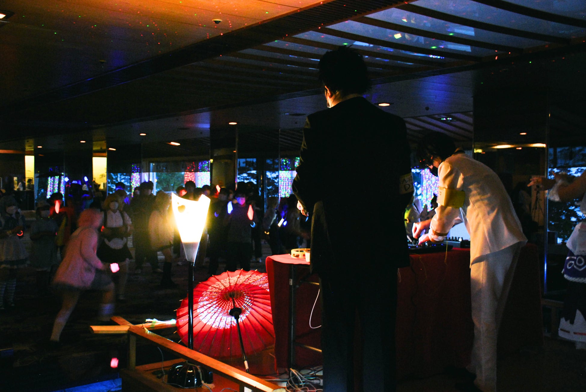 洞爺湖を一望するロビーがディスコ会場となり、 コスプレしたまま湖畔亭館内の