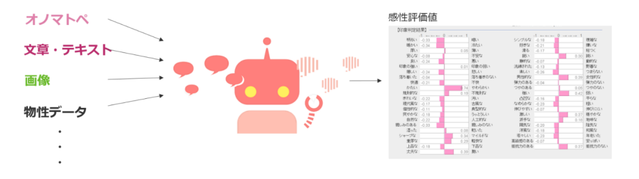 人は、感性(=様々なモノ・コトを見る / 触る / 味わうなどして五感で知覚し感じる能力)で感じとったモノ・コトの印象(質感、味わい、など)を、言語の情報(例:「さらさら」「とろり」などの擬音語・擬態語=オノマトペ)で表現します。感性AI株式会社では、この人の感性に結びつく様々な言語をはじめ、文章や画像などあらゆる情報の感性情報を人工知能(AI)により定量化する「感性評価AI」をコア技術としています。