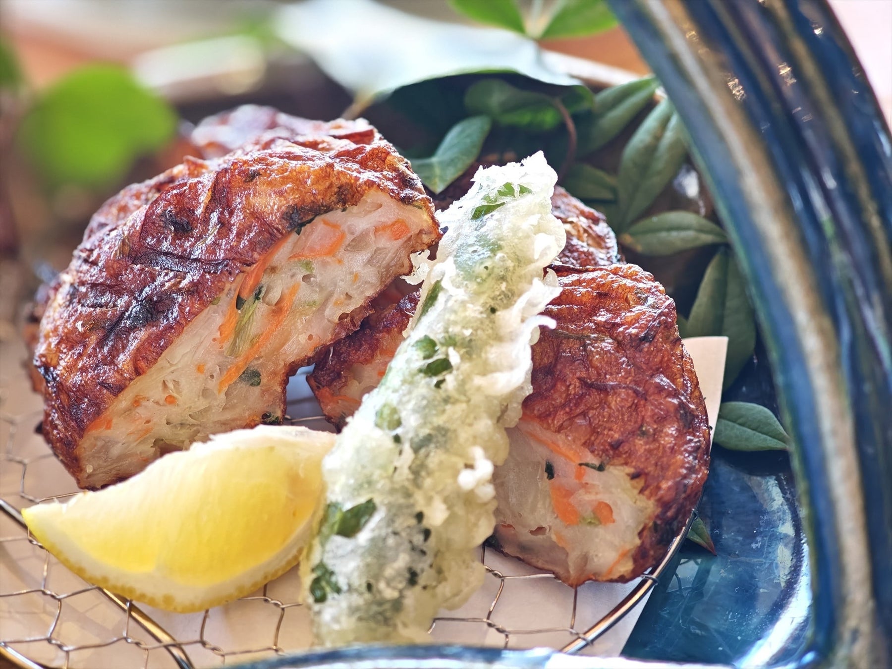 会席料理:春にんじんと淡路島玉ねぎの平天/春にんじんと鳴門鯛の東寺揚げ