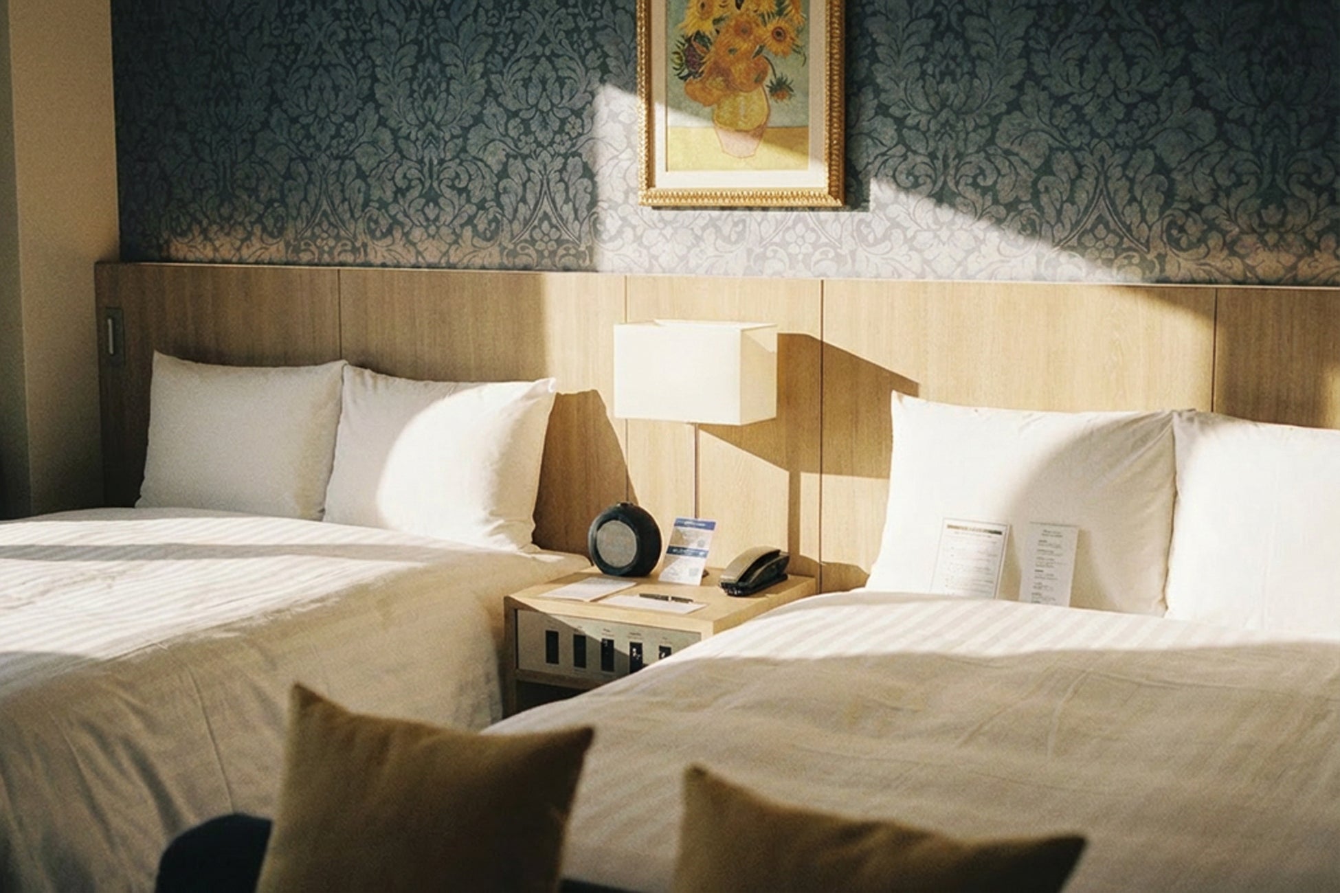 海を見晴らす洋室や和室、徳島の匠による阿波藍ルームなど旅のスタイルで選べる客室は15タイプ。2024年3月、徳島が誇る伝統工芸「大谷焼」アートプレートが彩る客室、7月には泊まれるアートギャラリー「ゴッホのヒマワリルーム」が誕生。