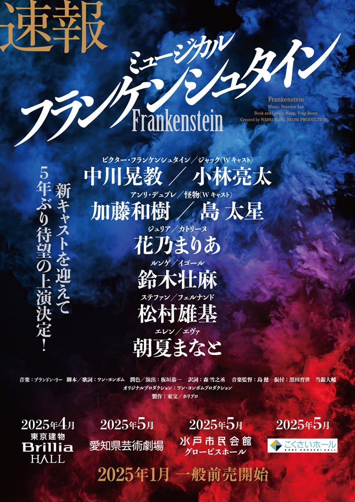 誰もが知っているゴシックロマンの名著「フランケンシュタイン」を大胆なストーリー解釈と流麗かつメロディアスな音楽でミュージカル化した『フランケンシュタイン』が2025年4月に待望の再演!この度、東京公演詳細&チケット販売スケジュールが解禁。さらに、アンサンブル&子役キャストも発表された。抽選先行は12月17日から受付開始。