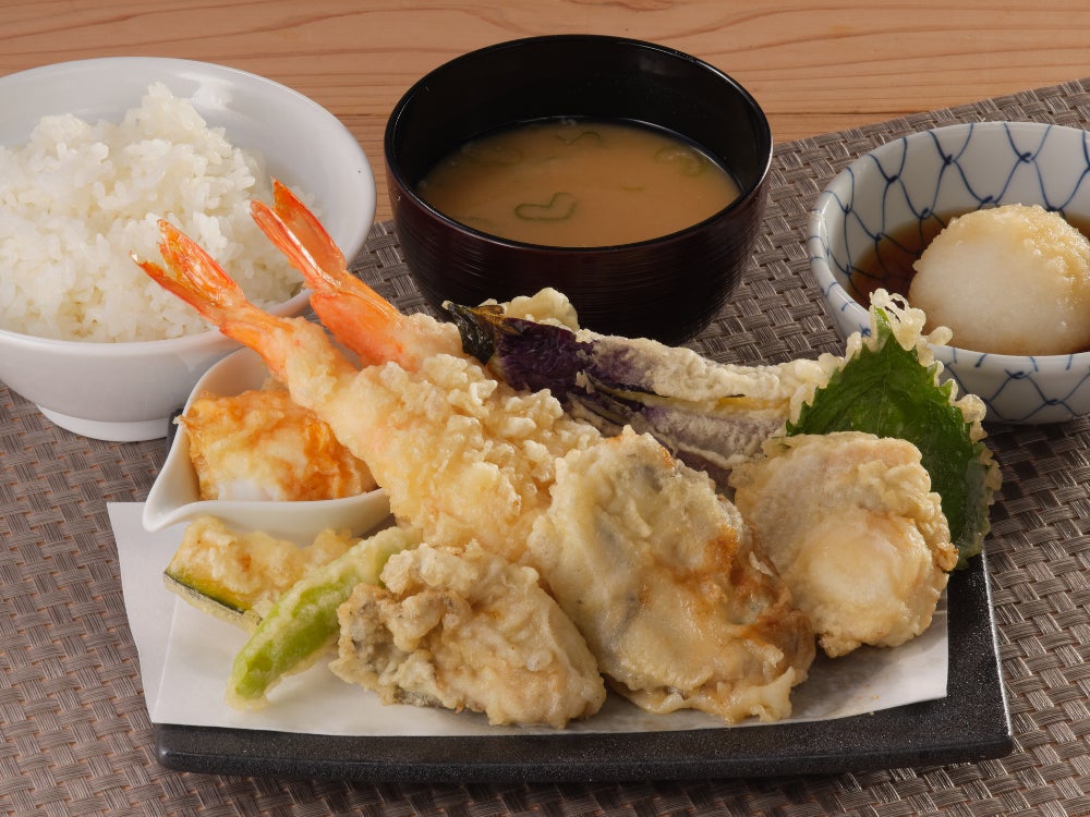 海老2本、海苔、かぼちゃ、大葉、茄子、いか、温泉玉子、ししとう、牡蠣2ヶ、帆立1ヶ・味噌汁付