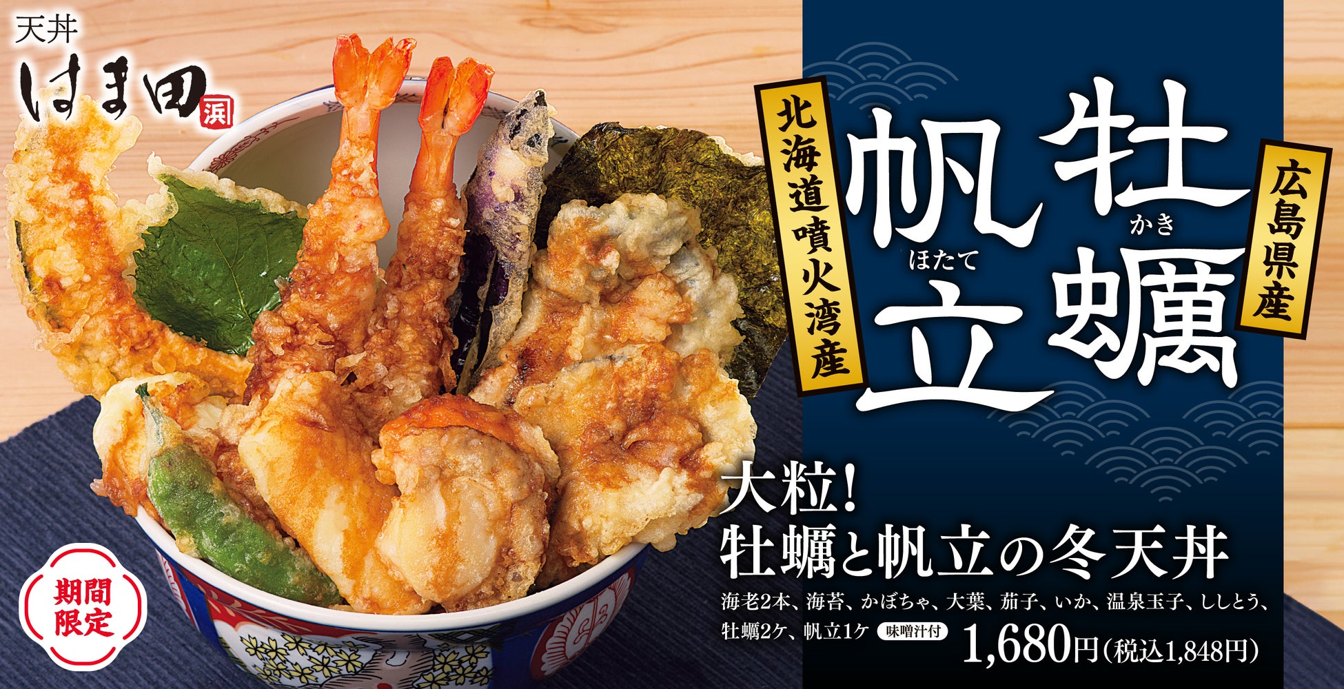 自分へのご褒美や家族と過ごす食事の時間に選びたくなる期間限定メニュー「大粒!牡蠣と帆立の冬天丼」を2024年10月16日(水)より期間限定で「天丼はま田」にて販売開始いたします。