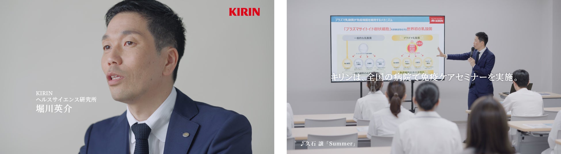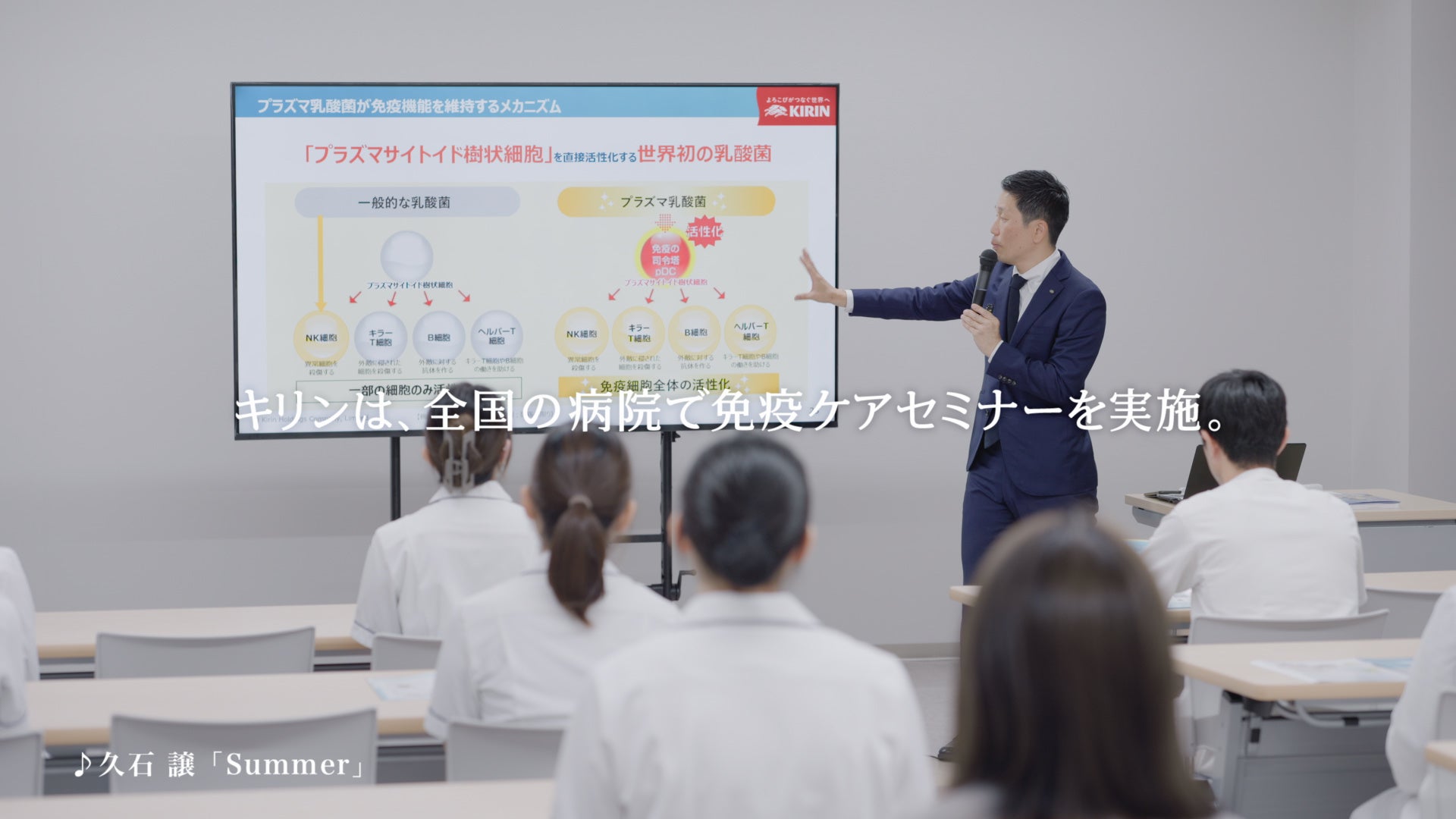 医療従事者向けの「免疫ケアセミナー」の様子や講師を務めるキリン ヘルスサイエンス研究所 堀川のインタビューを通じて、「免疫の大切さ」を広める活動を行うキリンの思いを伝えます。35年以上免疫について研究しているキリンだからできる健康サポートアクションで、「健康寿命を伸ばしてより楽しい社会、楽しい世界をつくっていきたい」という思いを語ります。