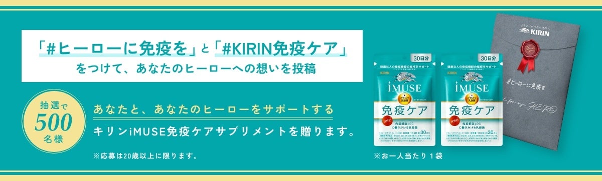 ・応募方法:公式X(旧Twitter)にて、キリンホールティングス公式アカウント(@Kirin_holdings)をフォローし、「#ヒーローに免疫を」と「#KIRIN免疫ケア」をつけて、「あなたのヒーローへの想い」を投稿すると、抽選で500名様に「キリン iMUSE 免疫ケアサプリメント」プレゼントキットをお届けします。