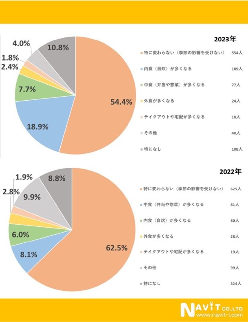 「特に変わらない(季節の影響を受けない)」という方が最も多く55.4%でしたが、昨年(62.5%)より7.1%減少しています。年々変化する気候に対して食べ物に対する考え方も変化しているのでしょうか。