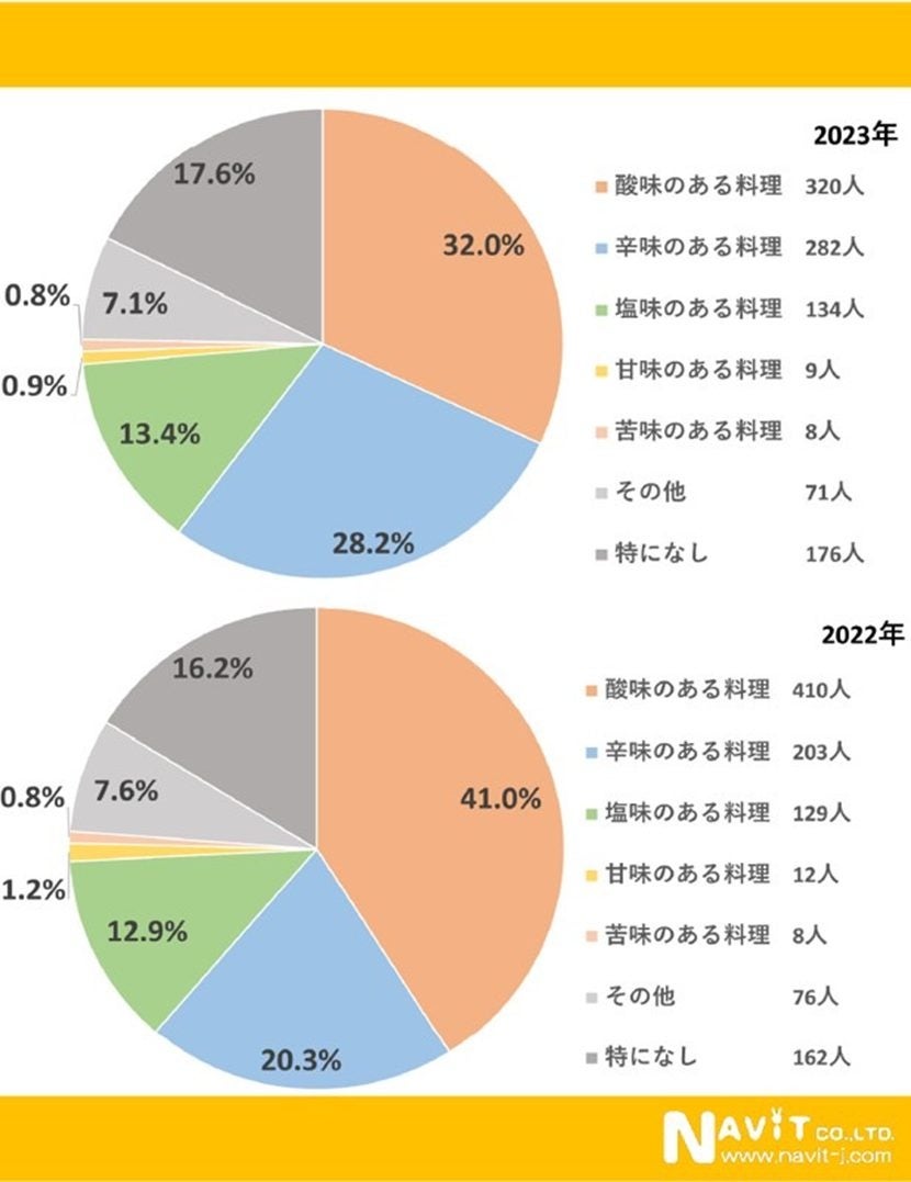 「酸味のある料理」が一番多く32.0%で昨年(41.0%)から9.0%減少しています。「辛味のある料理」が22.6%と続いており昨年(20.3%)より2.3%増加しています。次に「塩味のある料理」が13.4%と昨年(12.9%)より0.5%増加しています。