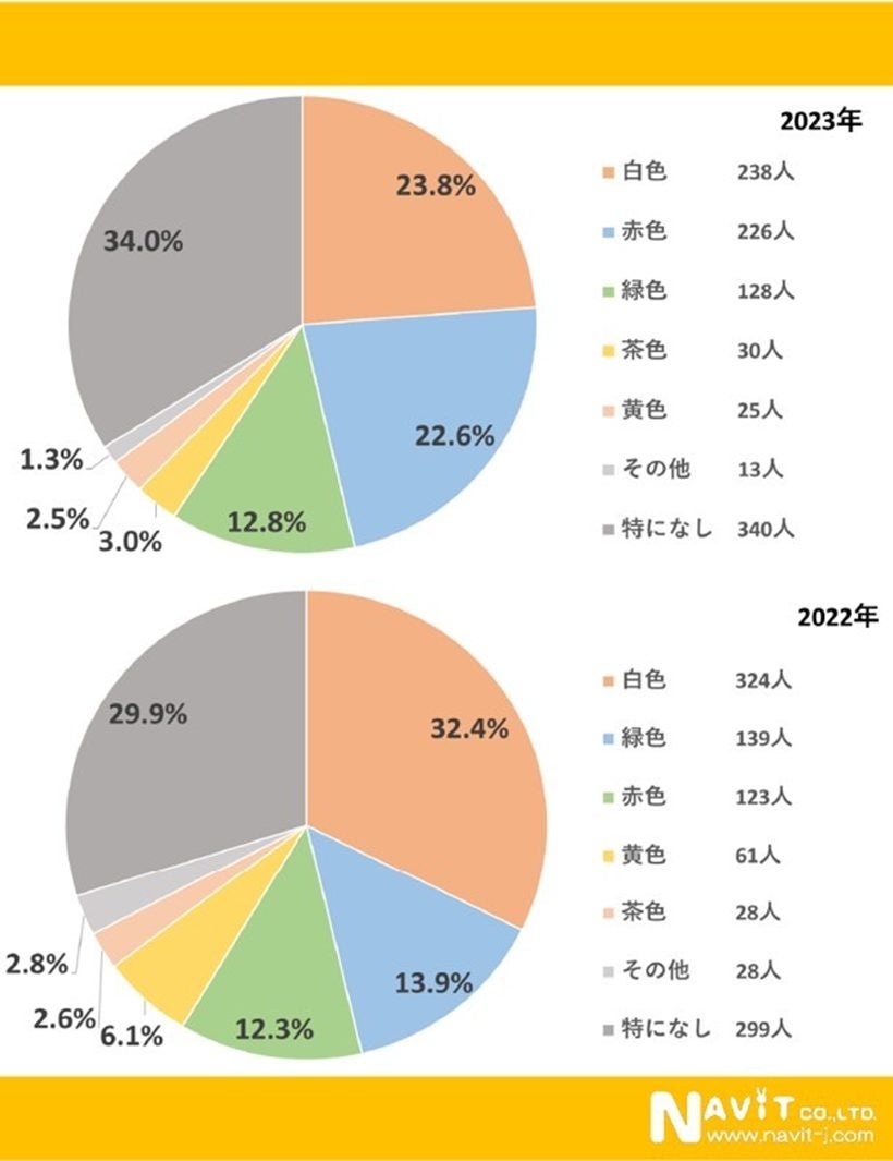 色に対して一番ニーズがあったのは「白色」で23.8%となっています。昨年(32.4%)より10%近く減少していますね。次に多かったのが「赤色」で22.6%となっており昨年(12.3%)より10%増加しています。3番目は「緑色」となっていて12.8%で昨年(13.9%)より0.9%減少しています。白色は不動の一位という感じですが、それ以外は順位の変動があるようです。
