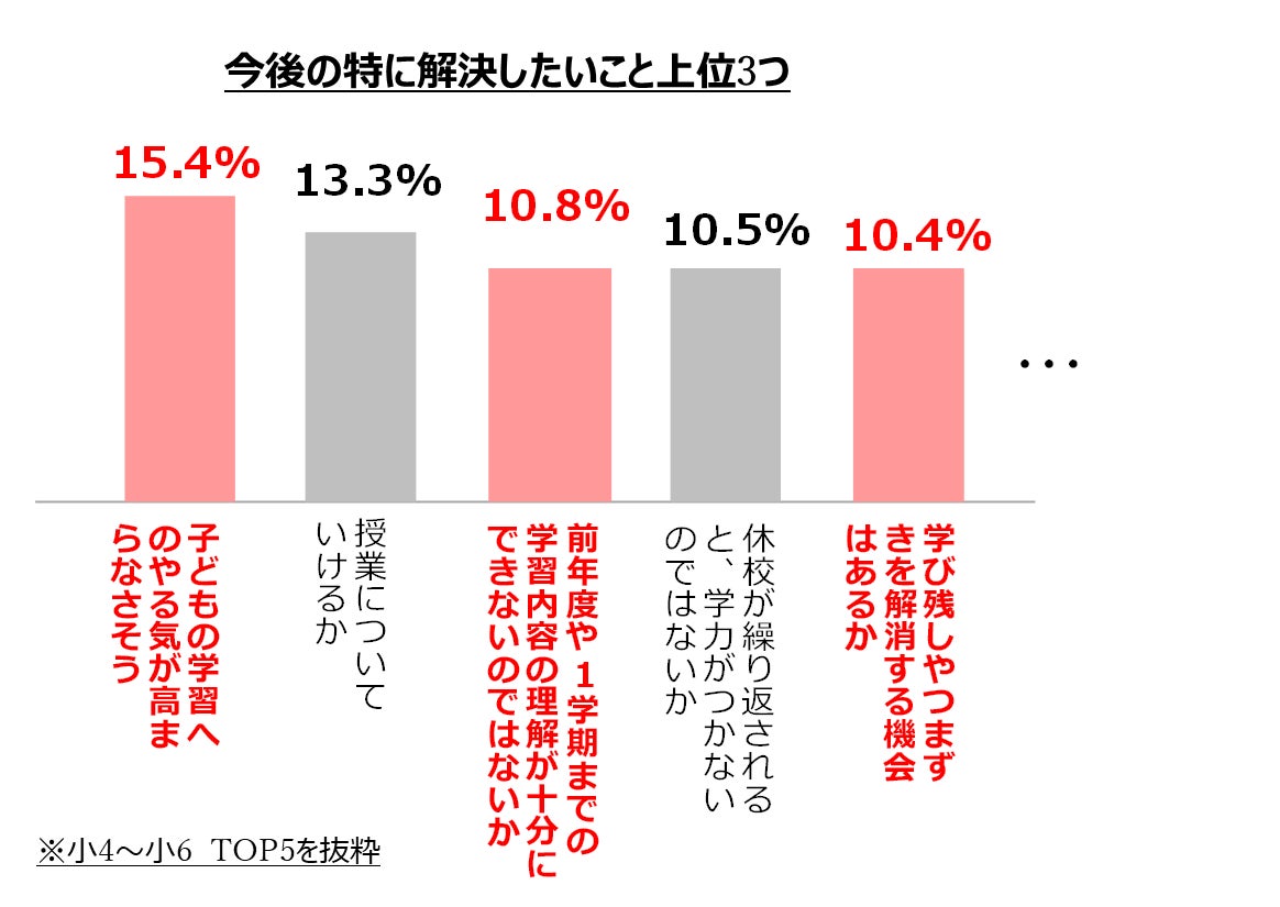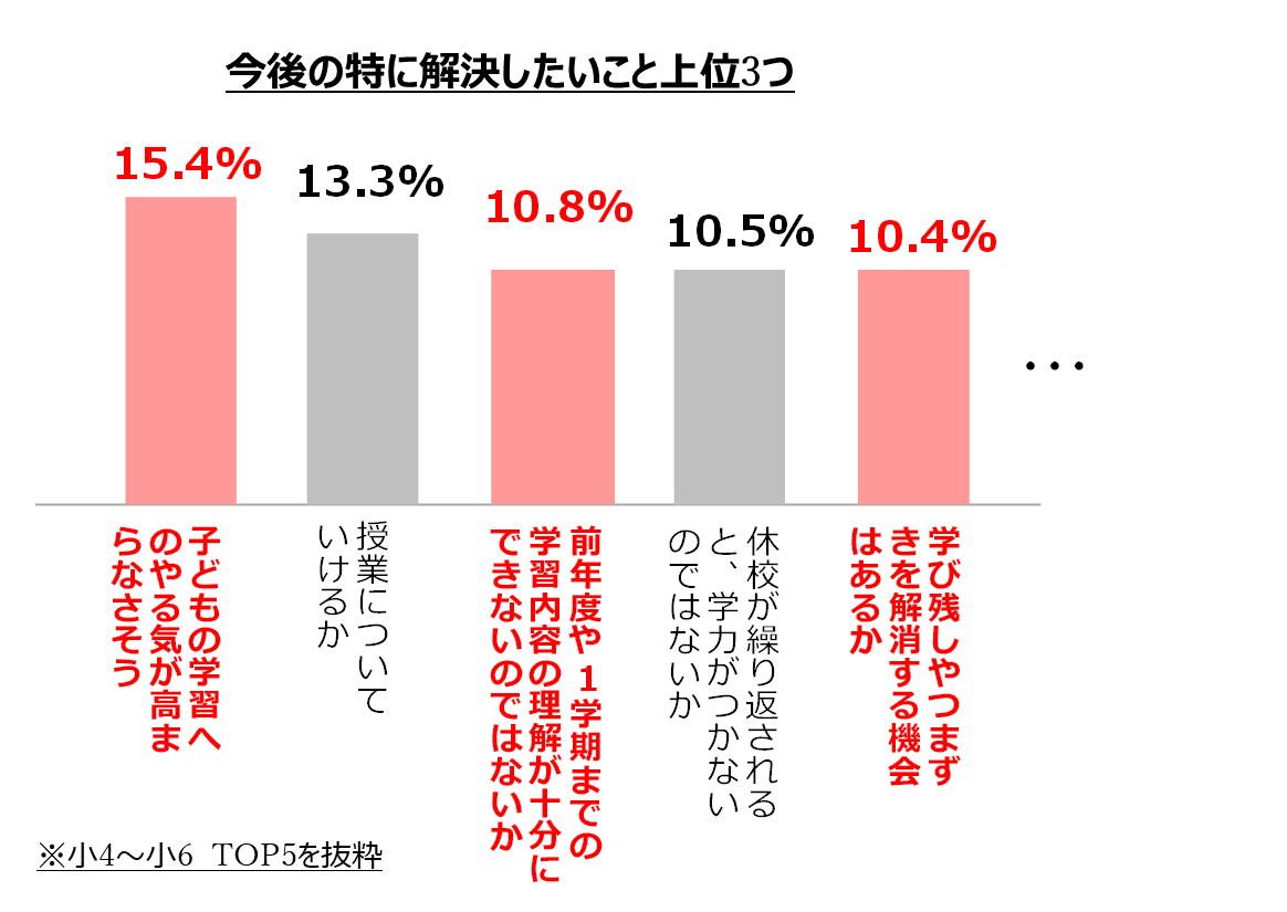 新型コロナウイルスのオミクロン株感染拡大による学級閉鎖や行事の中止が増加する中、保護者の方からは「臨時休校は終わったが、ダラダラと過ごしてしまっていたので勉強への影響が心配」「このまま次の学年になってしまって大丈夫なのか不安」といったお声をいただいています。またベネッセが独自に実施している定期調査でも、「子どもの学習へのやる気が高まるか」「つまずきを解消する機会はあるか」といった今後の不安を感じていることがわかりました。