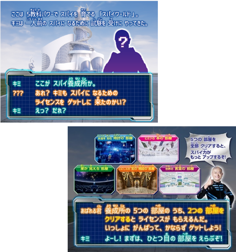 あばれる君と一緒に、スパイ養成所に入門。試験官の問題をクリアしながら、一流のスパイを目指すというストーリーの中で楽しく5教科のおさらいができる学習コンテンツです。