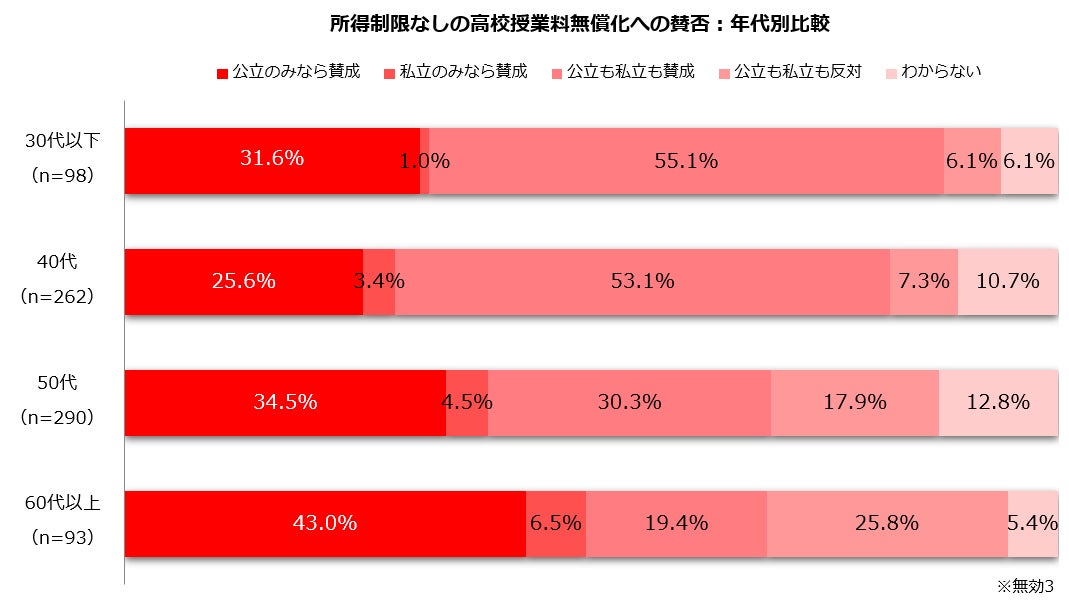 4.所得制限なしの高校授業料無償化への賛否:年代別比較