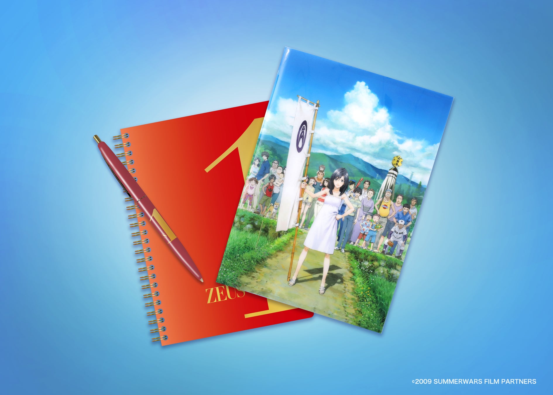 アニメーション映画『サマーウォーズ』のクリアフォルダと、ネイキッドオリジナルデザインのノート、ボールペンのステーショナリー3点がセットになった、オリジナルグッズセットの限定販売も決定しました。