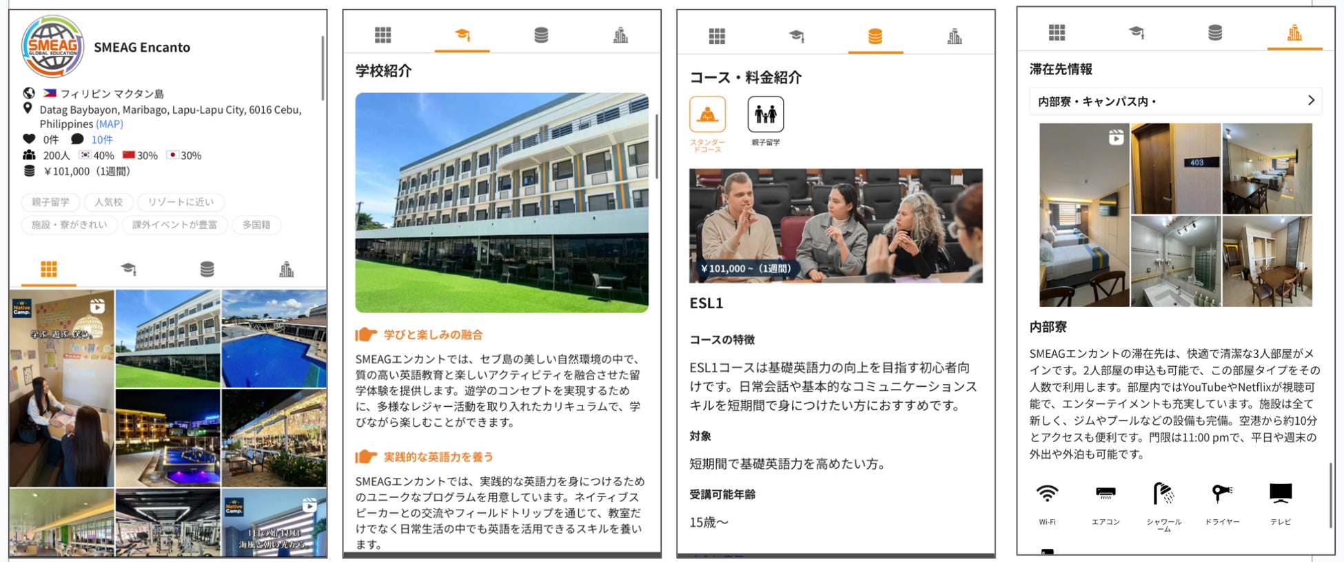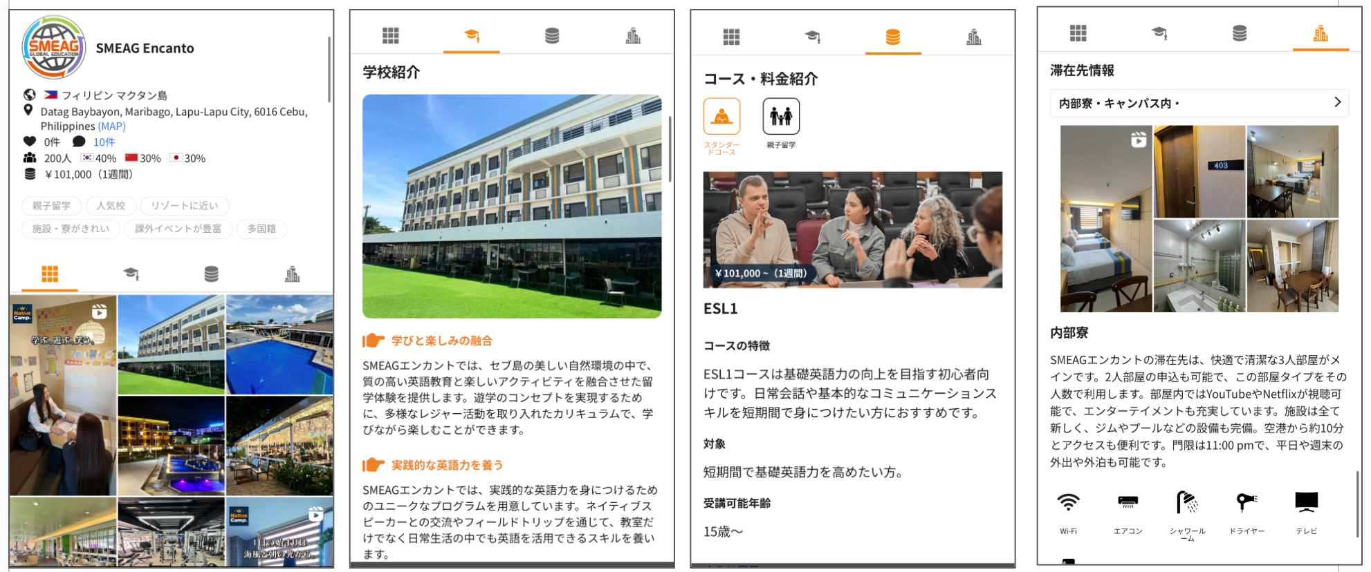 ネイティブキャンプ留学では、ユーザーが必要な情報を分かりやすく把握できるよう、常に丁寧で明確な情報提供を心がけています。SMEAG Encanto・Joyful Educationの詳細情報は、以下の4つのカテゴリーに分けて掲載しており、知りたい情報を的確にお届けします。