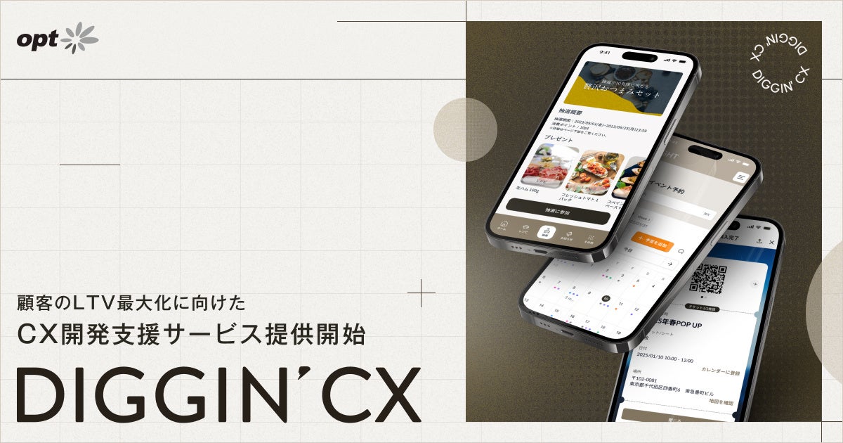 「新しい価値創造を通じて産業変革を起こし、社会課題を解決する。」をパーパスに掲げ、LTVM(LTV Marketing)(※1)により、顧客の事業成長を先導する株式会社オプト(本社:東京都千代田区、代表取締役社長 CEO:金澤 大輔、以下 オプト)は、多様化するユーザーニーズに対応し、企業の顧客体験(CX)の追求を支援するため、プランニングからサービスグロースまでワンストップでCX開発を支援する「DIGGIN' CX™(ディギン シ―エックス)」を、本年3月5日(水)より、正式提供開始することをお知らせいたします。