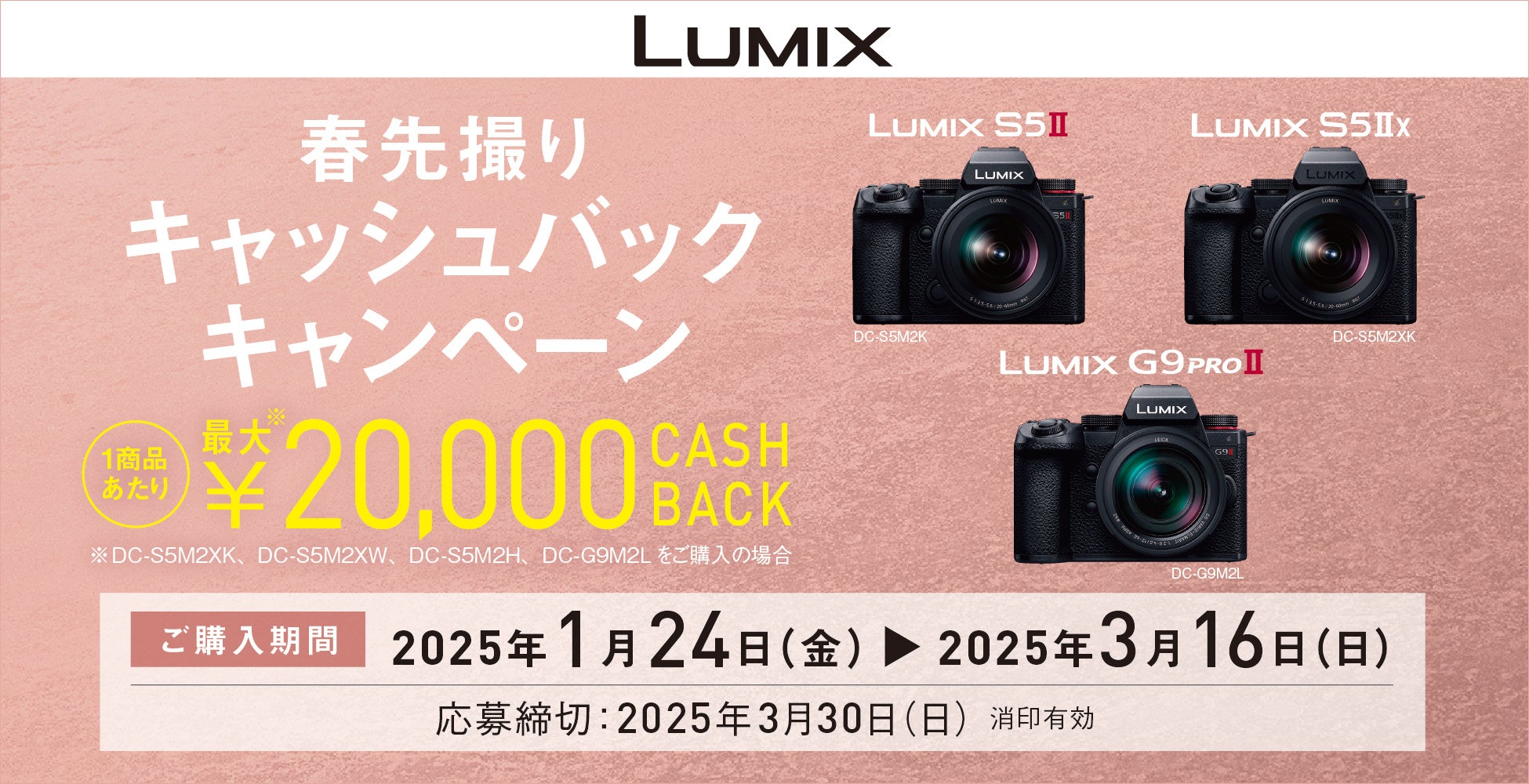 パナソニック株式会社は、フルサイズミラーレス一眼カメラ LUMIX Sシリーズ、ミラーレス一眼カメラ LUMIX Gシリーズをご購入の上ご応募いただいた方を対象とした「LUMIX春先撮りキャッシュバックキャンペーン」を2025年1月24日(金)より実施します。