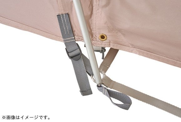 設営&撤収を簡単にするLOGOS独自の「SUPPORT BELT SYSTEM」を採用。フレームをセットした後、緩めたベルトを短く締めるだけの簡単設営。撤収時も、ベルトを緩めるだけでフレームをリングピンから簡単に外すことができ、力の弱い方でもスムーズに片付け可能。