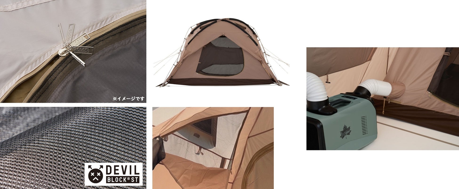 そのほか、手を持ちかえることなく一気に開閉が可能なLOGOS独自の「回転式ジッパー」やUV-CUT率・遮光率が通常比の約1.5倍かつ小さな虫の侵入も防ぐ高機能メッシュ「デビルブロックST」、雨の浸入や風の吹き込み、冷気を防ぐフルマッドスカート仕様、電源コード取り込み口の冷気を遮断するジッパーや空気が循環しやすいC型ドアなど様々な機能を採用することで、快適なアウトドア空間を実現します。さらに、インナーテント入口ドア付近にポータブルクーラー用差し込み口を配置しており、別売りのポータブル式キャンピングエアコン「(野電)エレキャン・エアコン-BF」を設置することでインナーテントに冷気を送り込むことができ、暑い季節も快適にアウトドアを楽しめます。