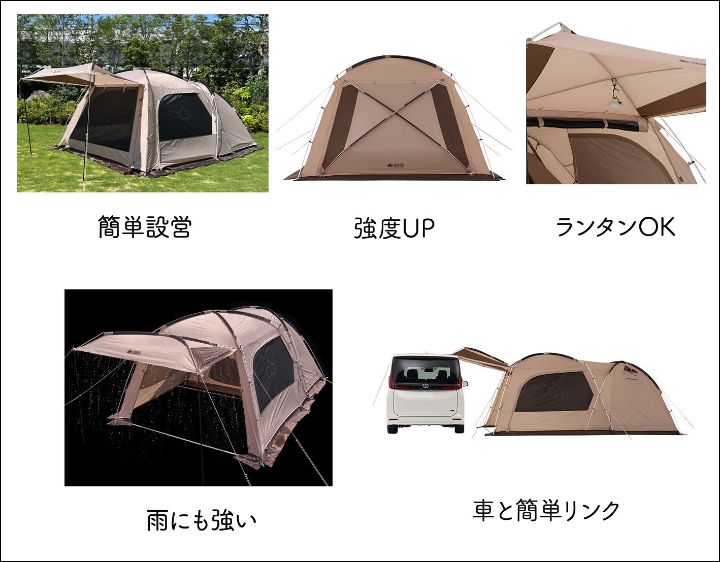 従来モデルからフレーム形状を変更した、LOGOS独自の新型PANEL SYSTEM採用により、居住性と耐風性がより向上しました。新型PANEL SYSTEMは、クロス状に組み込んだフレームを湾曲させ、角度をつけた設計です。従来モデル同様、テント前面にクロス状のフレームを配置することで全体の強度を高めつつ、角度のあるトップ部分を支点にフレームが左右に開く力を働かせることで外部からの圧力を分散し、天候の影響を受けにくい耐風性に優れた構造になっています。また、別売りの2本のポールで支えるだけでテントと一体化したタープとなるため、居住空間が広がります。新型PANEL SYSTEMはキャノピー使用時に頂点が入り口側に来る構造のため、天井の高い部分が拡張し、居住性が向上しています。従来モデル同様、湾曲しているので雨だまりも防止するほか、クロス部分にランタンを吊り下げることも可能です。さらに、標準装備の車体連結用ジョイントを使用すると、簡単に車とテントをリンクでき、プライベート空間が広がります。