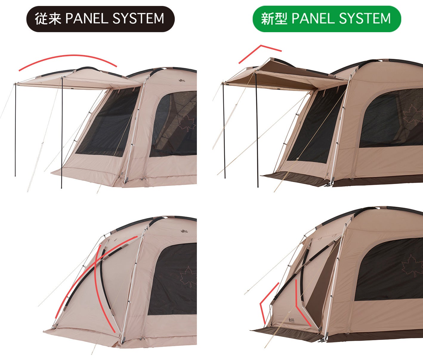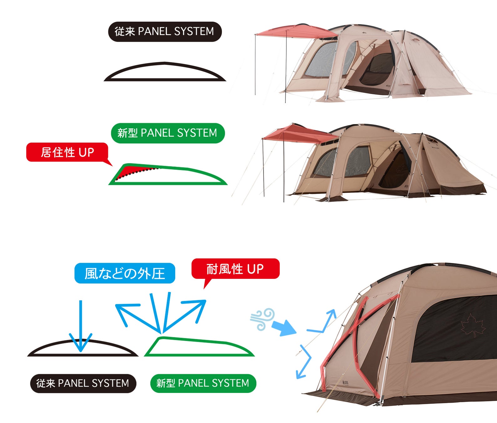 LOGOS独自の新型PANEL SYSTEM採用により、従来のPANEL SYSTEMの利点はそのままに、居住性と耐風性がさらに向上。新型PANEL SYSTEMは、クロス状に組み込んだフレームを湾曲させたうえ、角度を付けているため、キャノピー使用時に天井の高い部分が拡張し、居住性が向上。また、角度のあるトップ部分を支点にフレームが左右に開くように力が働き、外からの圧力を分散させるため、より天候の影響を受けにくい耐風性に優れた構造となっている。