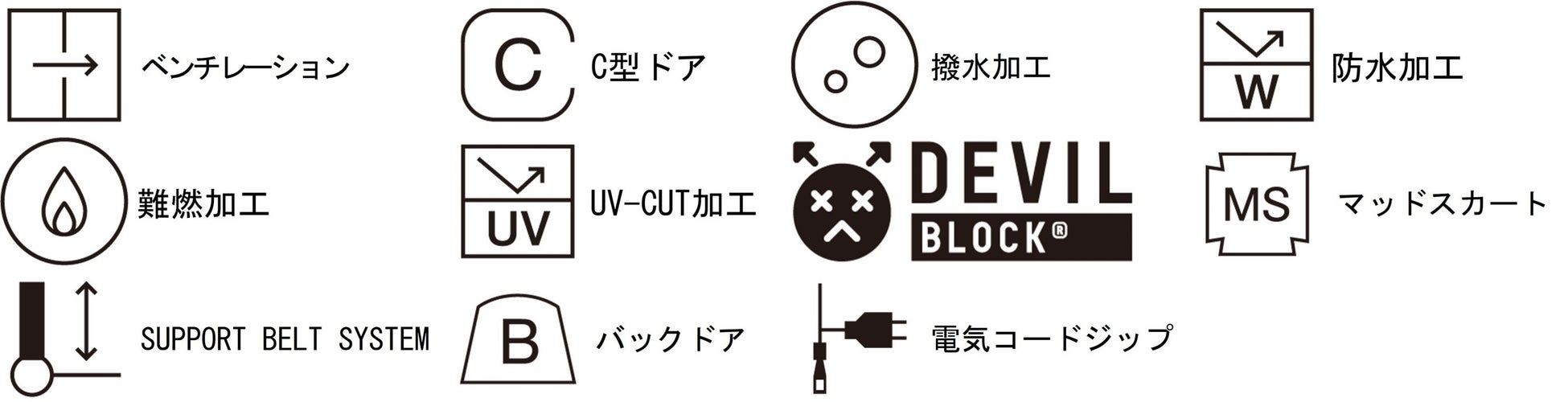 手を持ちかえることなく一気に開閉が可能な「回転式ジッパー」やUV-CUT率・遮光率が通常比の約1.5倍かつ小さな虫の侵入も防ぐ高機能メッシュ「デビルブロックST」、雨の浸入や風の吹き込み、冷気を防ぐフルマッドスカート仕様、電源コードの取り込み口の冷気を遮断するジッパーや空気が循環しやすいC型ドアなど様々な機能を採用。