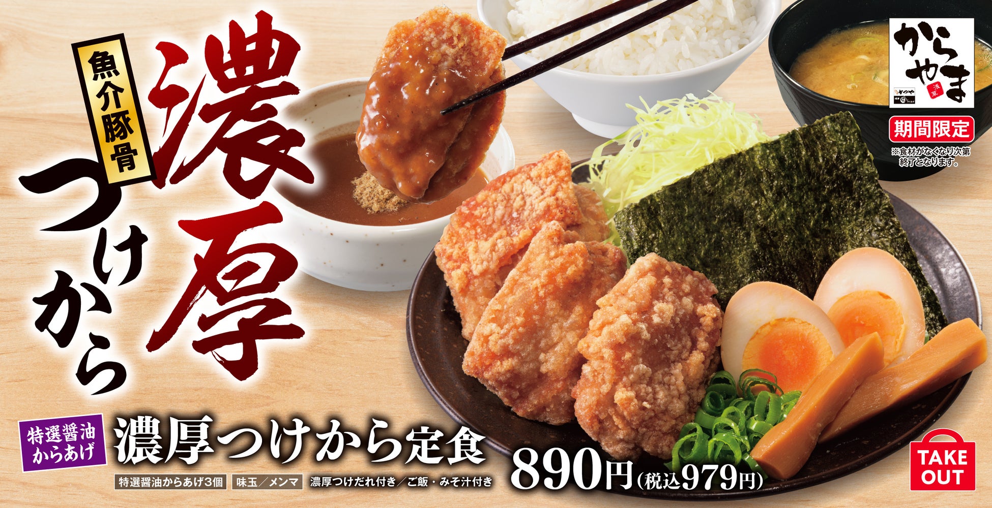 ひと手間くわえたからあげ定食と、定食を注文すると無料で提供され、ご飯に合うと評判の「いかの塩辛」が話題のからあげ定食専門店「からやま」にて、昨年期間限定で販売し大変ご好評いただいた「濃厚つけから定食」を刷新し、2024年10月25日(金)より販売開始いたします。