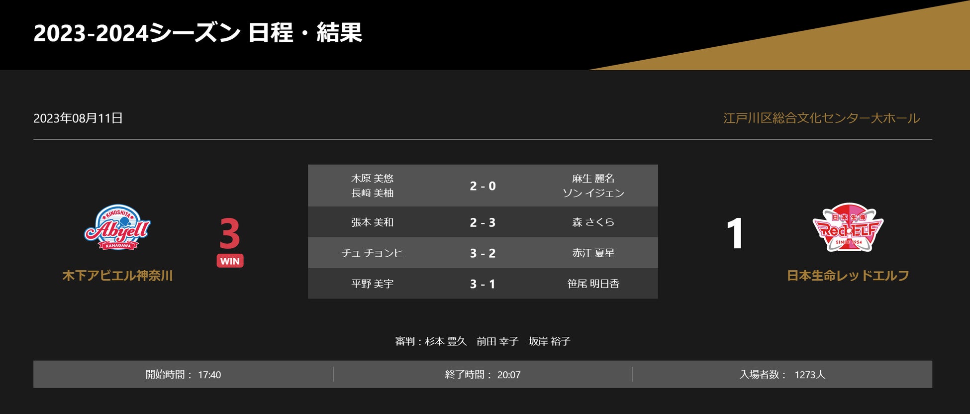 ノジマTリーグ 2023-2024シーズン 公式戦 8月11日開催 木下アビエル神奈川 vs 日本生命レッドエルフ 試合結果
