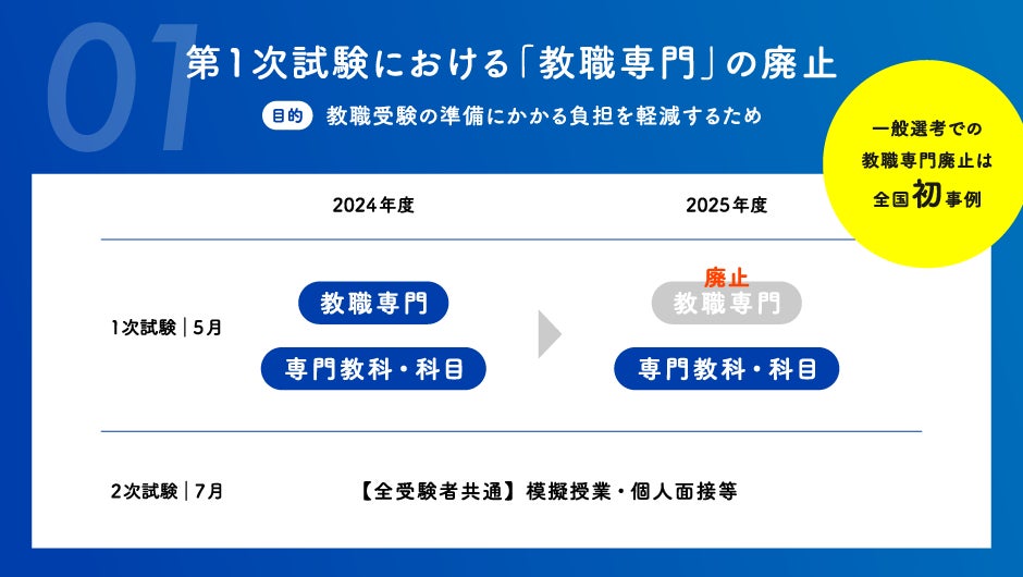 茨城県が次に挑むのが、全国初の試みとなる「新たな形式での教員採用選考」です。従来の選考とは異なり、志願者が一次試験の受験方法を選択できる形をとることで、民間出身者を含め様々なバックグラウンドを持つ教員の採用を目指します。今回募集するのは、公立の小学校・中学校・高校・特別支援学校の教諭と養護教諭、栄養教諭です。応募には教員免許状を必須としますが、採用試験においては、これまで一次試験で実施してきた、教育に関する総合的な知識を問う「教職専門」を廃止。受験の準備にかかる負担を軽減し、志願者の増加を図ります。