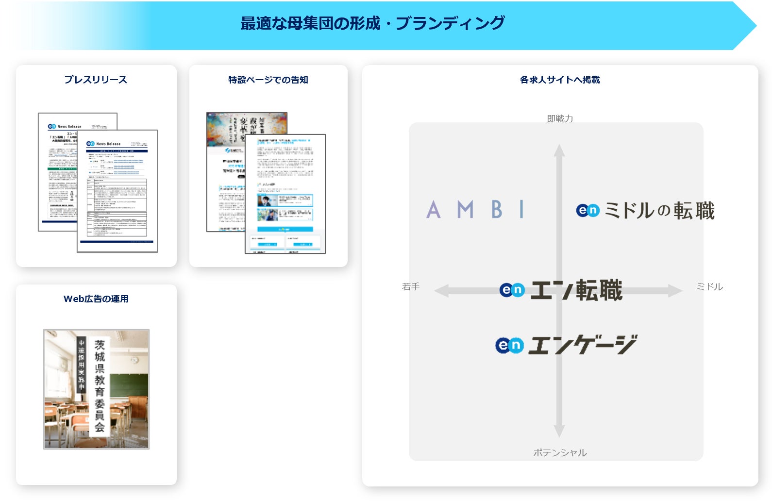 プレスリリースや特設ページ、Web広告での告知に加え、各求人サイトでの集客支援を実施。『エン転職』『エンゲージ』『AMBI』『ミドルの転職』とターゲットの異なる求人サイトを活用することで、ターゲットへ網羅的に求人を届けます。