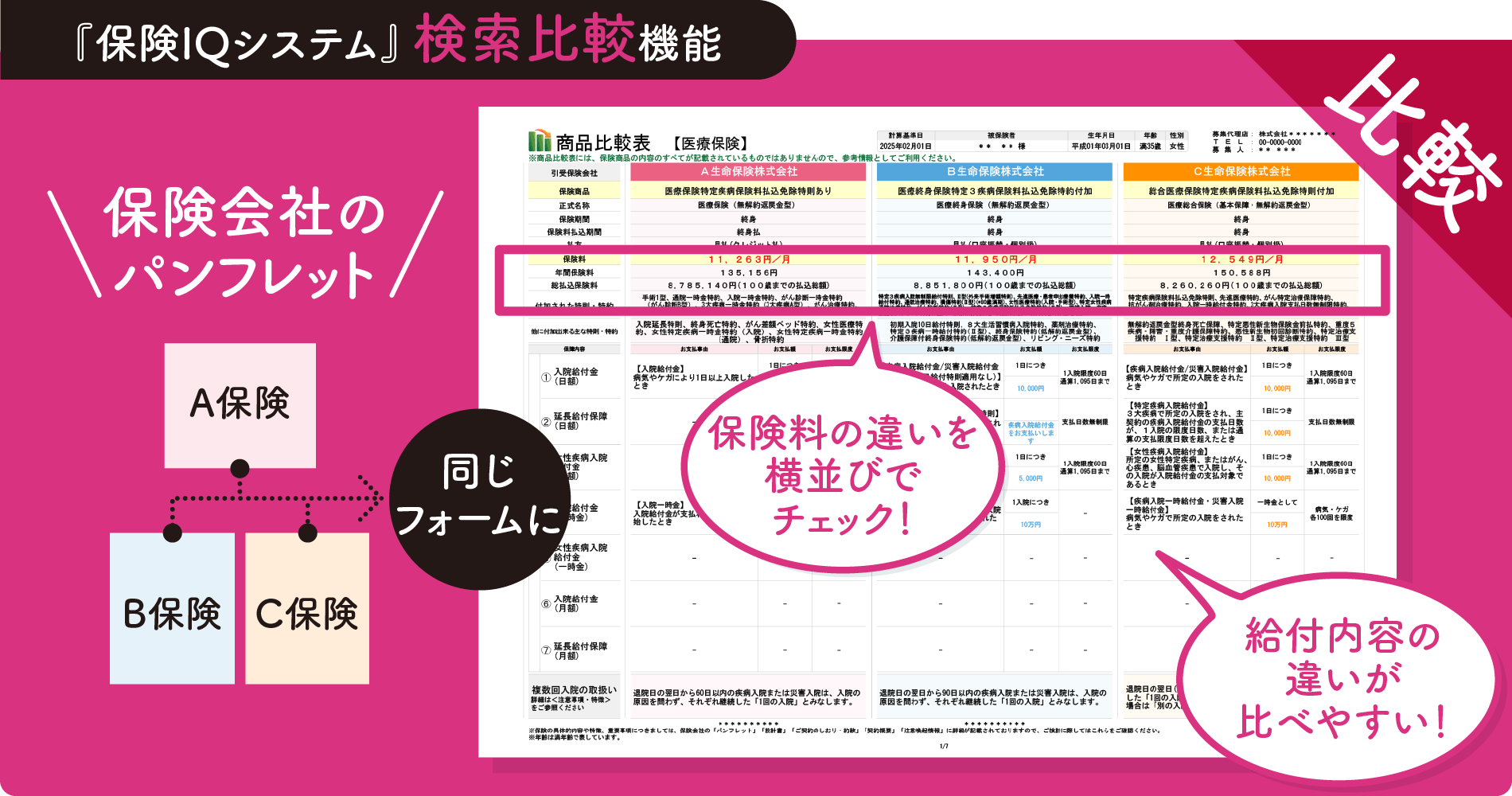 新しく保険の加入や見直しを考えている方向けの機能です。お客様のご希望をもとに保険商品を検索し、その中からさらにお客様のご希望に沿った複数の保険商品を同じフォーマットで並べた比較表をお出しします。別々の保険会社・保険商品で並べたり、同じ保険商品の中でも保障額や特約を変更して並べることもできます。ご希望に沿わない場合は条件を変更して何度でもお出しいたしますので、ご納得できるまで比較いただけます。