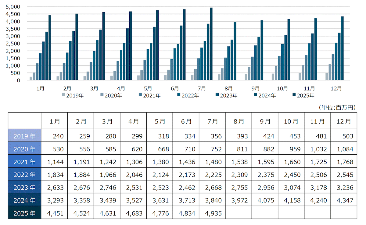 (注)ARR(Annual Recurring Revenueの略称で、契約更新のタイミングで全て更新される前提で、1年間で得られると想定される売上高)は、決済手段により3か月毎に1か月の日数(通常月は28営業日、特別月は35営業日)に変動があること、四半期決算期末月毎に決算調整を行っていること等から、月次では金額が変動するため、3か月移動平均を採用しております。