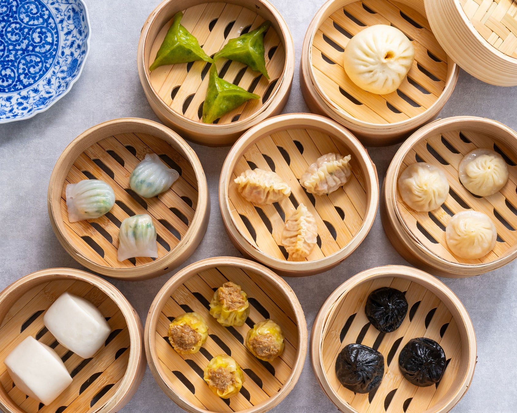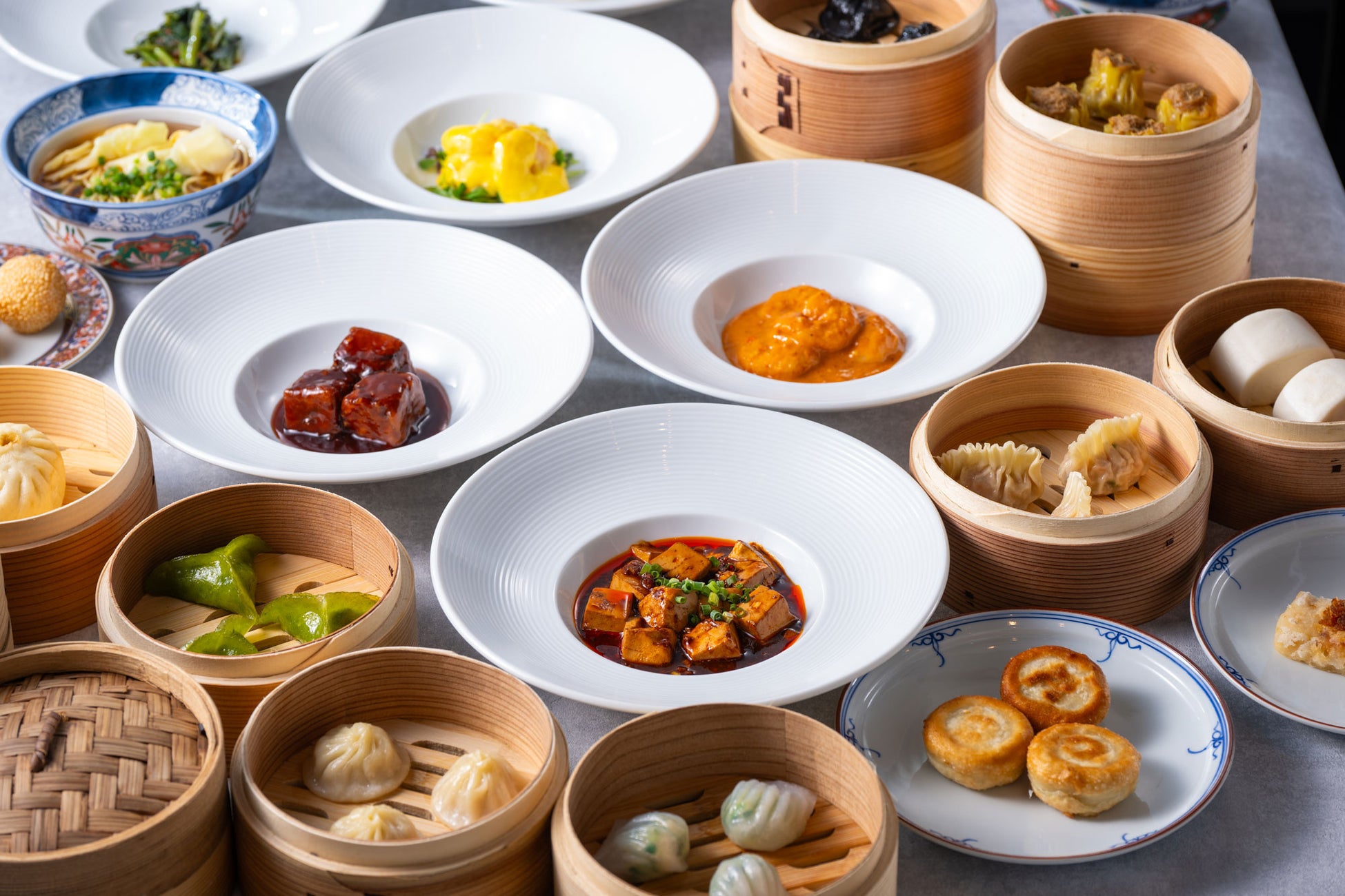 上海小籠包/白身魚と豆苗の蒸し餃子/フカヒレ蒸し餃子/水餃子の紅油ソース/自家製肉まん/ミルクパン