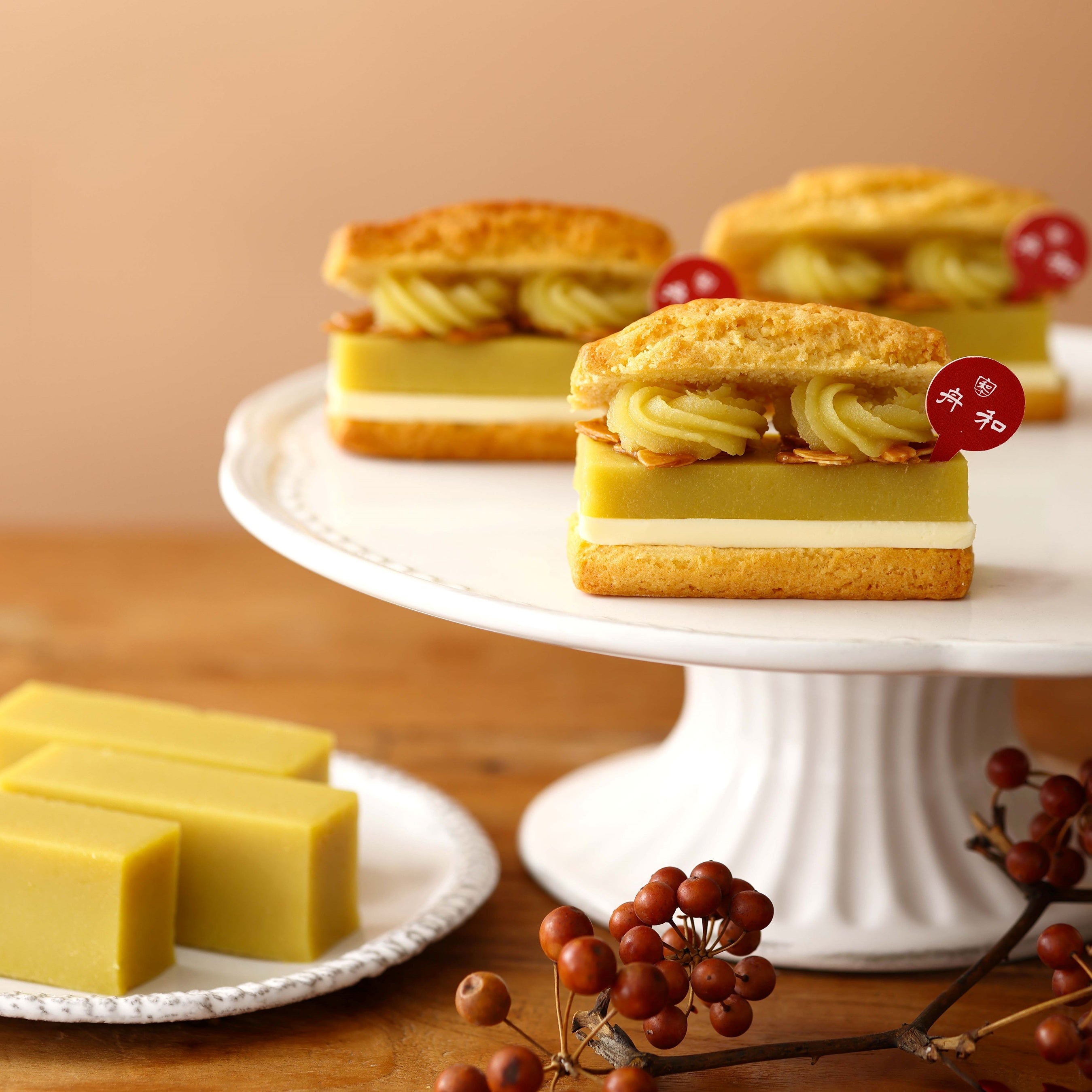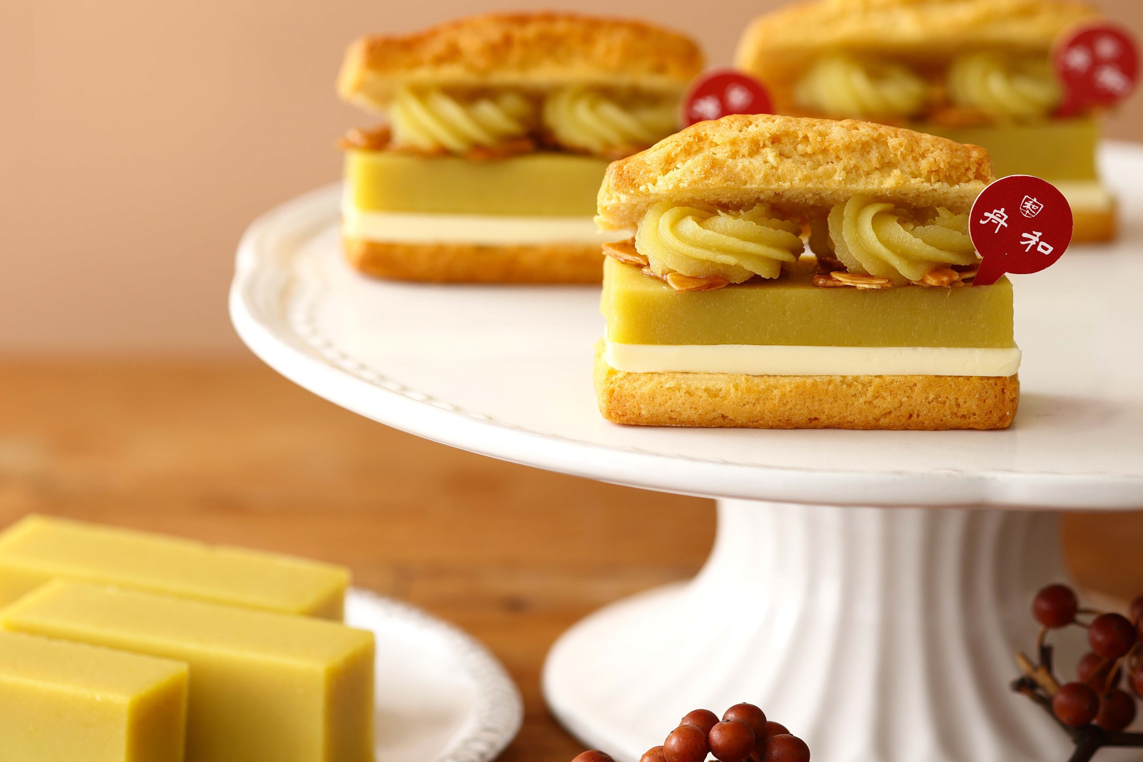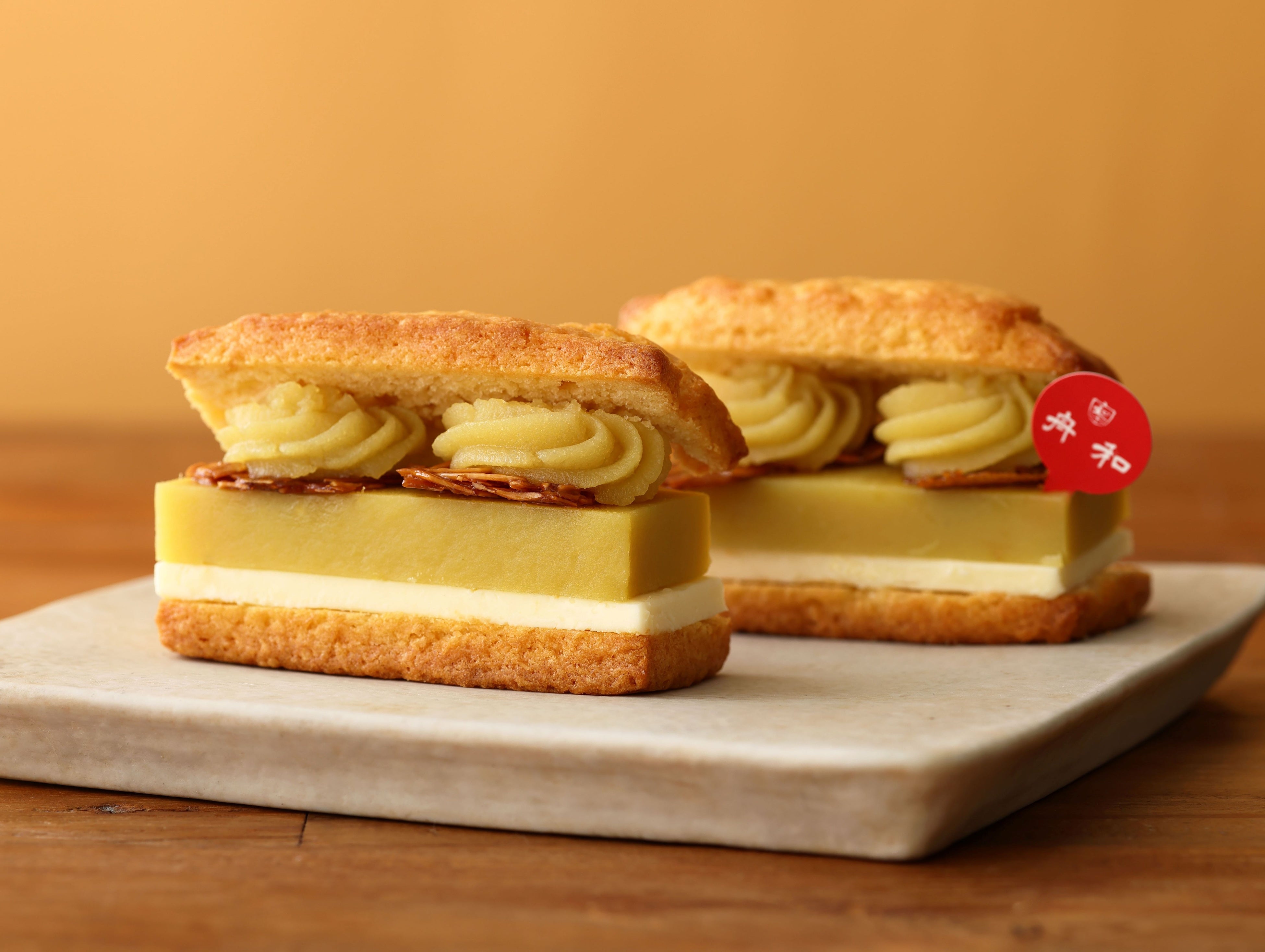 舟和の芋ようかんとさつまいもペーストを使用し、爽やかな酸味とコクが特徴の発酵バターと合わせ、アーモンドチュイールをサンドしました。