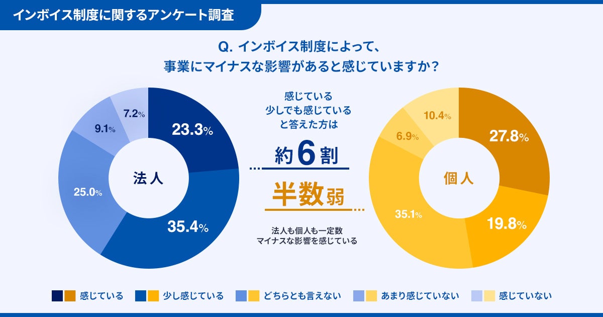 ・インボイス制度のマイナス影響を、法人・個人事業主共に約5~6割が「感じている」と回答