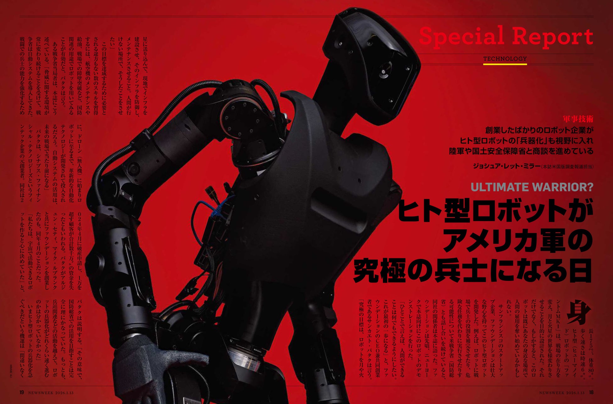 トランプ政権による年明け早々のベネズエラ攻撃とマドゥロ大統領の拘束が世界を驚かせましたが、この作戦に先立ち、米軍はドローンを使って同国の港湾施設を攻撃していました。ウクライナ戦争は「戦場の無人化」が進む現実をまざまざとわれわれに見せつけていますが、その究極の形がAIを搭載したロボット兵士でしょう。サンフランシスコのスタートアップ企業ファウンデーション社が開発する人型ロボット「ファントムMK1」は、将来の月面や火星の探査だけでなく、戦場で兵士の役割を果たすことまで想定しています。最先端のヒューマノイドは何を、どこまでできるようになっているのか。1月6日発売号の特集「AI兵士の新しい戦争」で詳しくルポしました。(長岡)