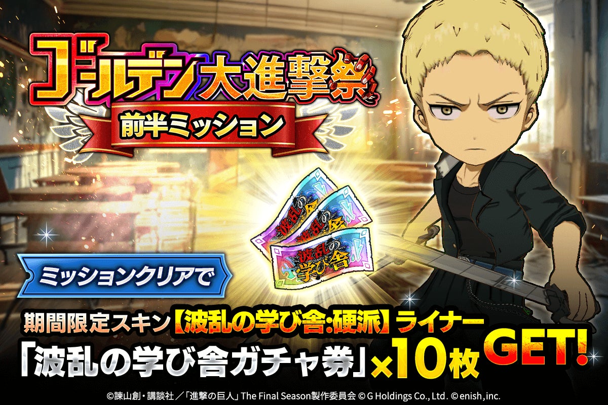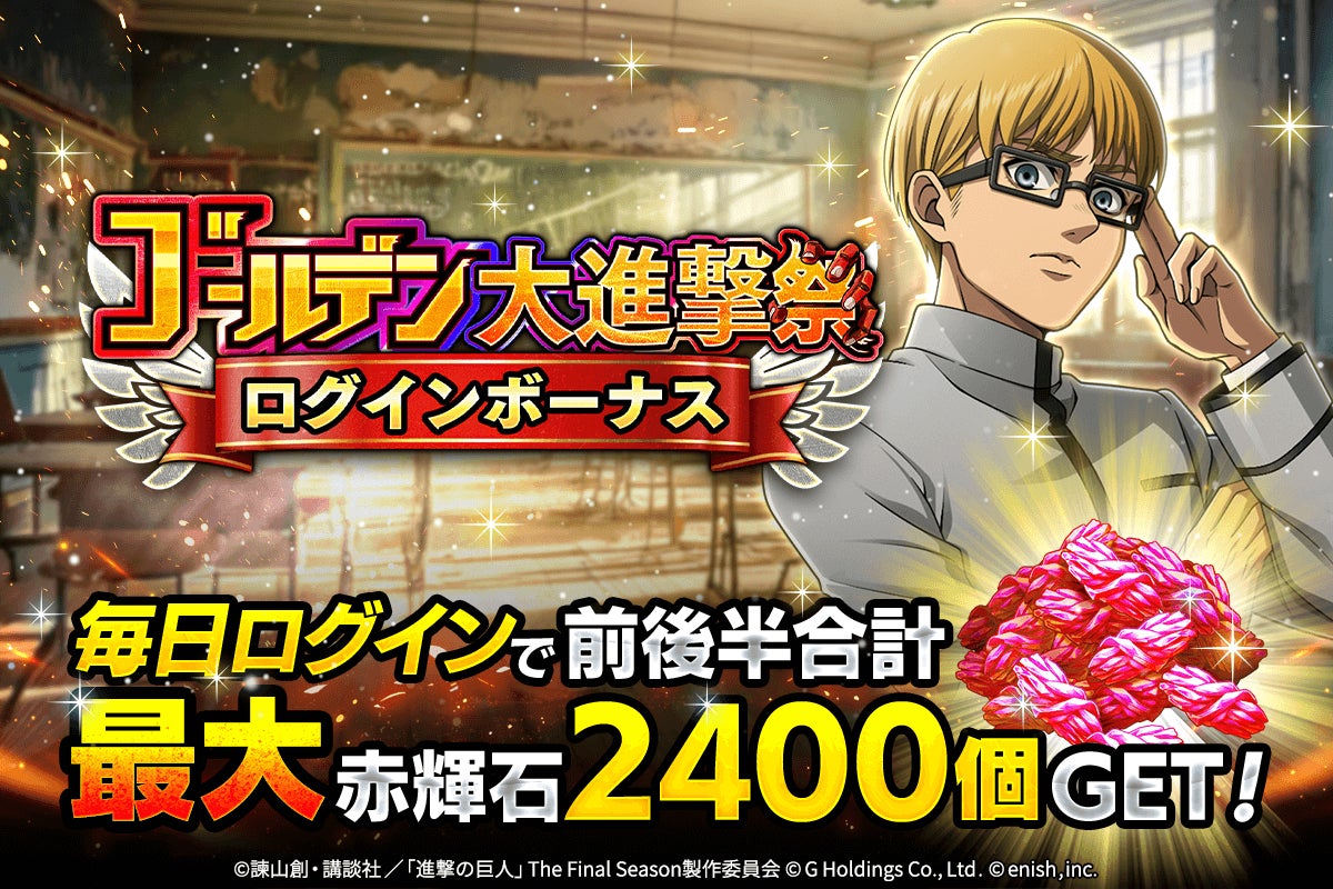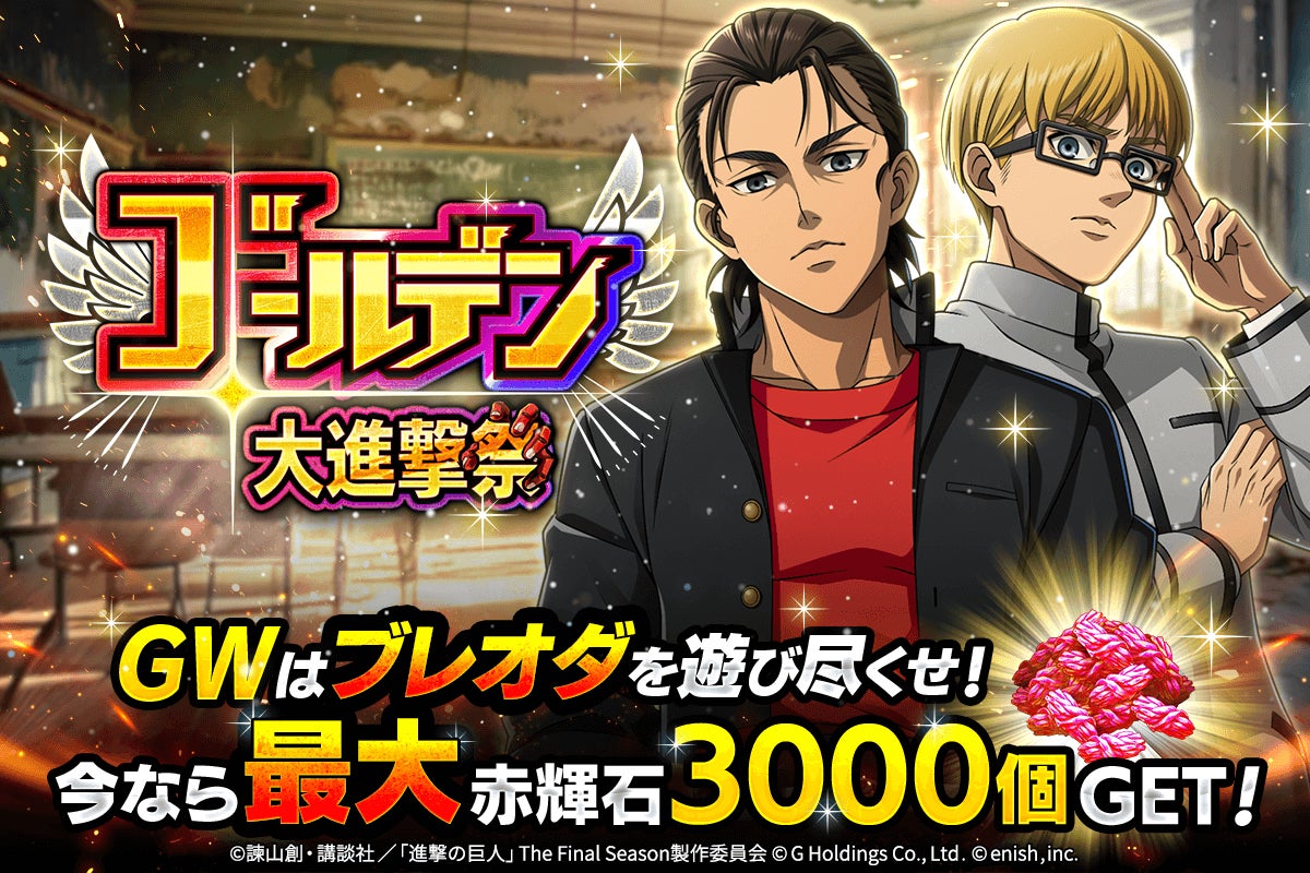 株式会社enish(本社:東京都港区、代表取締役社長:安徳 孝平、以下enish)は、アニメ『進撃の巨人』のスマートフォンゲーム最新作「進撃の巨人Brave Order」にて、2025年4月24日(木)より、ゴールデン大進撃祭を開催!今ならガチャなどに使用できる赤輝石が最大3,000個もらえちゃう!またゴールデン大進撃祭前半ミッションではライナーの特別な衣装、波乱の学び舎イベントでは育成素材の熟練技能書が最大300個がGET可能!その他、最新情報はゲーム公式サイト・ゲーム公式X(旧Twitter)アカウントにて随時公開して行きますので、ぜひご覧ください。