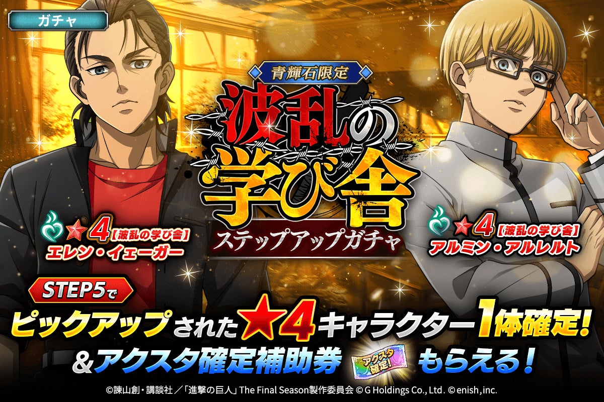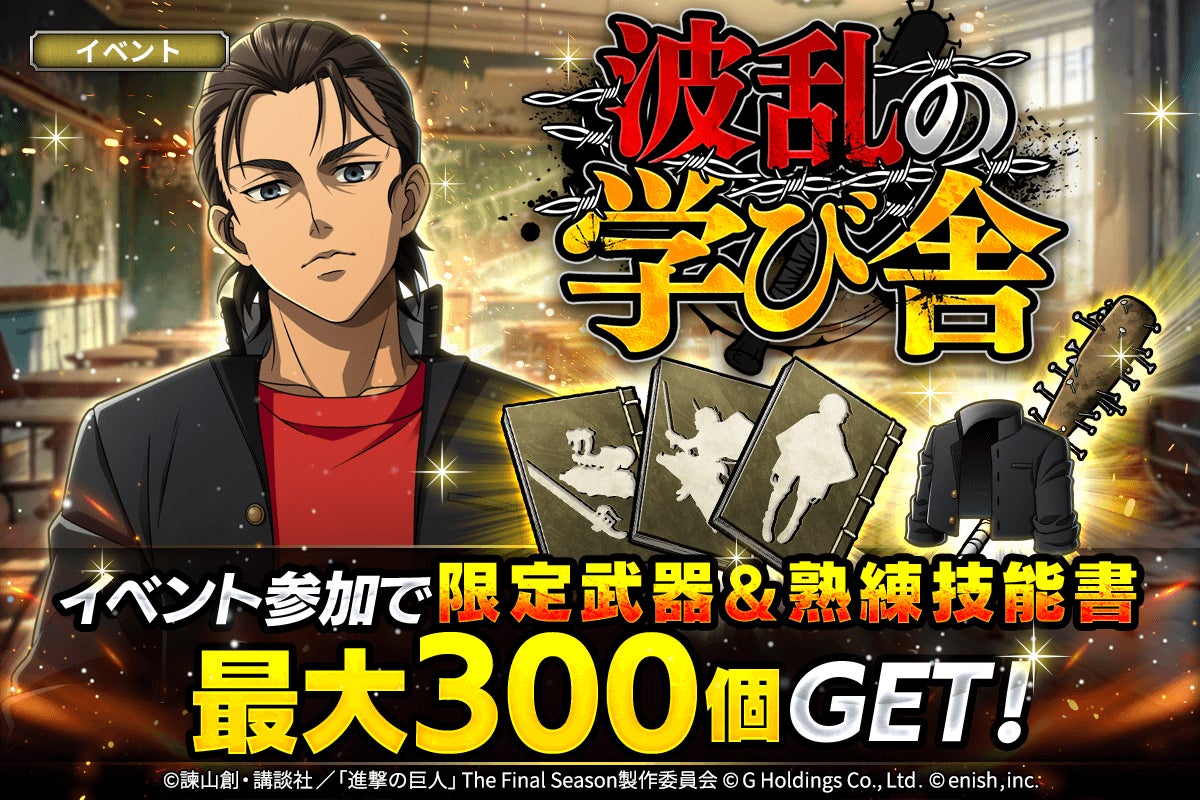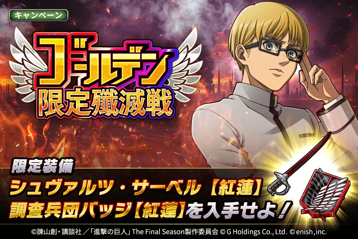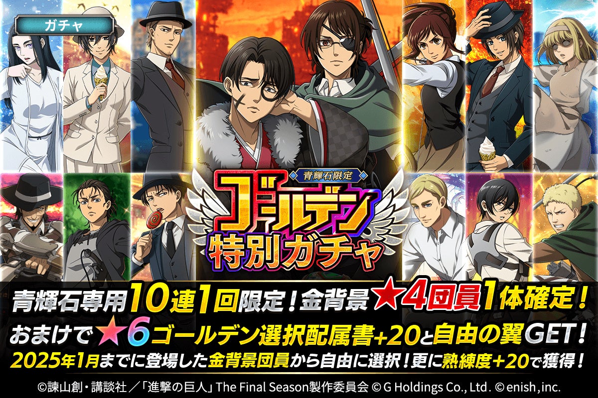 株式会社enish(本社:東京都港区、代表取締役社長:安徳 孝平、以下enish)は、アニメ『進撃の巨人』のスマートフォンゲーム最新作「進撃の巨人Brave Order」にて、2025年4月24日(木)より、ゴールデン大進撃祭を開催!今ならガチャなどに使用できる赤輝石が最大3,000個もらえちゃう!またゴールデン大進撃祭前半ミッションではライナーの特別な衣装、波乱の学び舎イベントでは育成素材の熟練技能書が最大300個がGET可能!その他、最新情報はゲーム公式サイト・ゲーム公式X(旧Twitter)アカウントにて随時公開して行きますので、ぜひご覧ください。