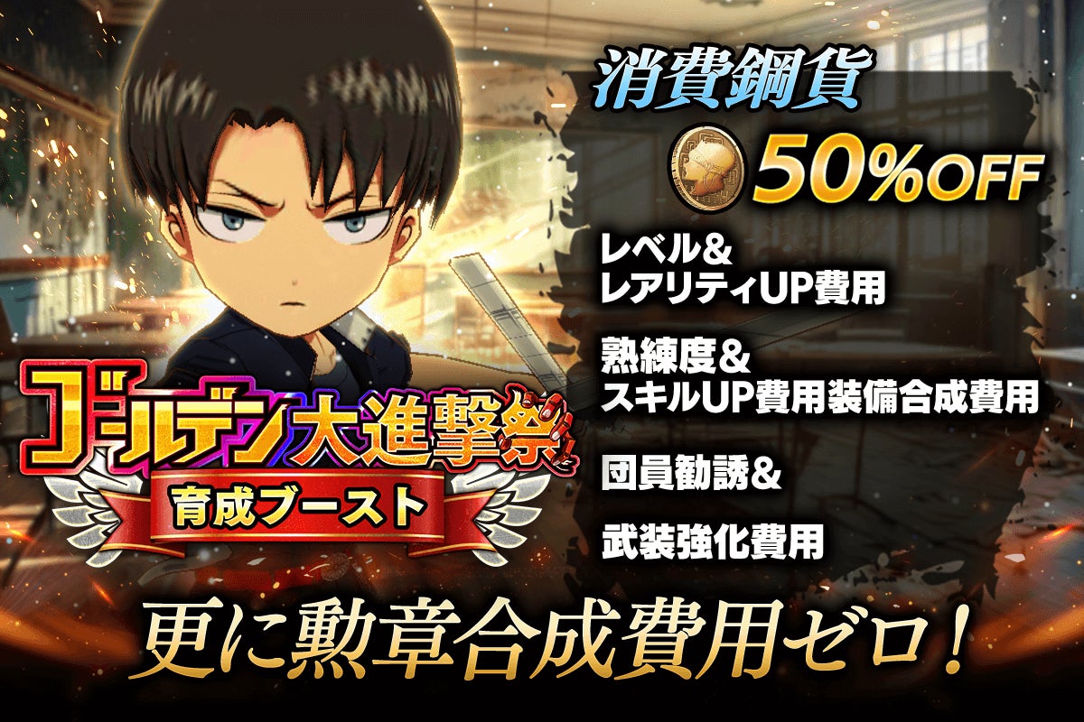2025年4月24日(木)より、団員のLvアップやレアリティーアップなどの育成費用が半額になるゴールデン大進撃祭育成ブーストを開催!この機会に団員を強化し強敵に挑もう!
