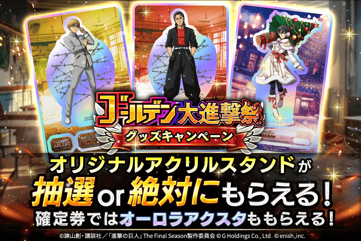 2025年4月24日(木)より、波乱の学び舎で登場するエレン、アルミン及び【聖夜の配達人】ミカサをモチーフにした限定アクリルスタンドが抽選又は絶対にもらえちゃうグッズキャンペーンを開催!限定アクリルスタンドがもらえるこのチャンスを見逃すな!