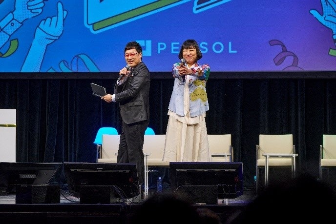 山里さんが、しずちゃんこと山崎静代さんに来場者の方が新社会人であることを伝えると、「みんな、私みたいになりたいと思ってそうな目をしてる」と感想を述べ、山里さんが「今頷いている方は首から上がボランティアですね」とツッコミを入れるなどコンビとして息のあったトークを見せました。