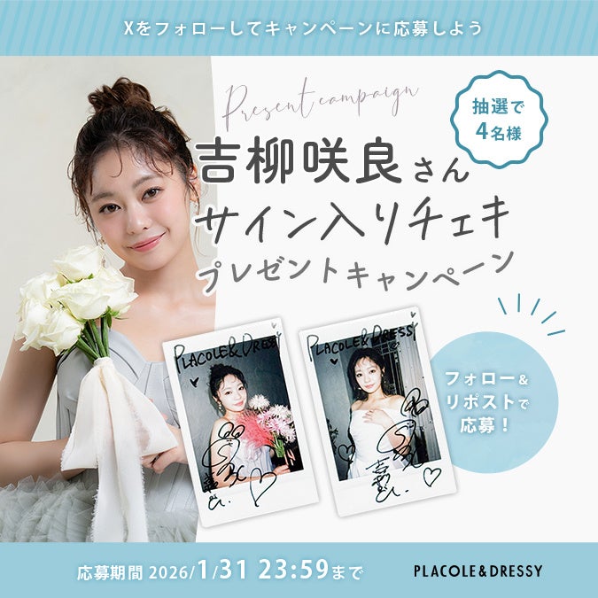 「PLACOLE & DRESSY」ブランドを展開する、冒険社プラコレ(本社:神奈川県鎌倉市、代表取締役CEO:武藤功樹)は、ウェディングドレスをもっと身近に楽しんで欲しいと考え「ウェディングドレスに憧れるすべての人へ」PLACOLE&DRESSYが贈る、特別コンテンツをスタート。2026年1月は俳優 吉柳咲良さんを迎え、メッセージを頂きました。