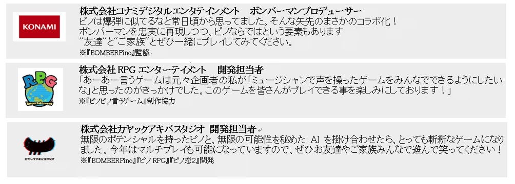 そして第二弾としてARゲームが楽しめる「ピノゲー」の新パッケージ(4タイトル)を10月9日(月)より全国にて期間限定発売します。人気タイトル「ボンバーマン」の最新作『スーパーボンバーマン R 2』が好評発売中であるゲームメーカーKONAMIとのコラボレーション『ボンバーピノ(BOMBERPino)』に加え、昨年注目を集めた『ピノ恋』の続編となる『ピノ恋2』、協力プレイでクリアする『ピノRPG』、そして、声で遊ぶ『ピノピノ言うゲーム』をラインアップ。オンラインマッチングなど、みんなで遊べる機能も搭載しています。