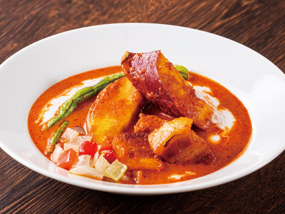 さつまいもの甘みとレッドカレーの辛味がマッチ。カリッと素揚げした豚肉でさらに旨味がアップ。