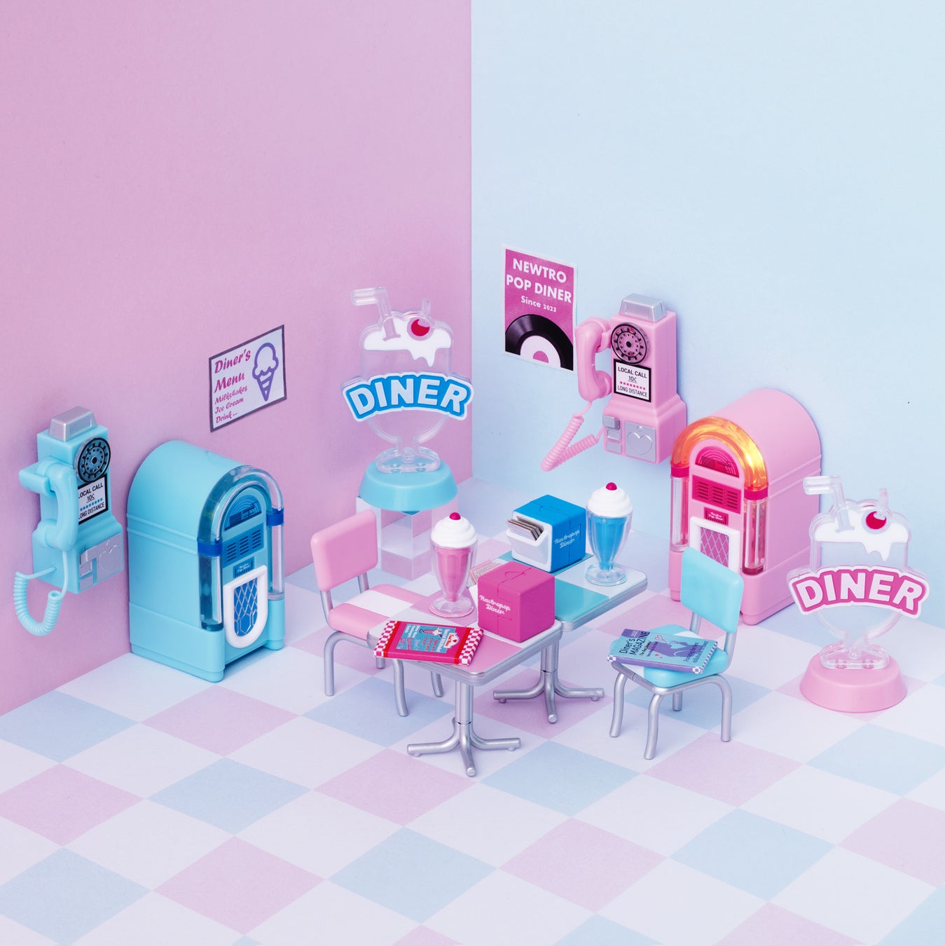レトロなアメリカンダイナーのミニチュアが登場!ジュークボックスやローカルコールなど、レトロでかわいいモチーフがポップカラーになって、K-POPのPVのようなシーンを演出。ブルーとピンクの2色展開です。 価格:400円/1回(全10種) ©BANDAI |
