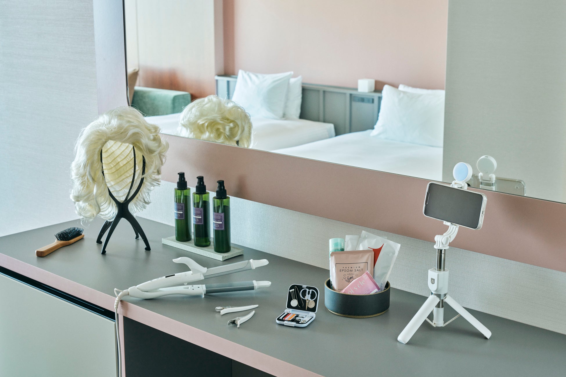 このプランで宿泊する客室には、仮装の準備時に身支度を整えるのに便利なアイテムと、仮装を楽しんで帰ってきた後の疲れを癒すアイテムを用意しています。ヘアセット用のヘアピンやヘアゴム、ヘアスプレー、ヘアアイロンは、うっかり忘れてしまったときや荷物を減らしたいときやに便利です。また、ウィッグスタンドを1人1つ用意しているので、衣装のウィッグを形を崩さずに置いておくことができ、急に衣装が壊れてしまった際にも簡易ソーイングセットを用意しているので安心です。さらに、全力で仮装を楽しんだ後の疲れを癒すアイテムとして、入浴剤やフェイスパック、足裏シートを用意しているので、帰ってきてからゆっくり疲れを癒せます。