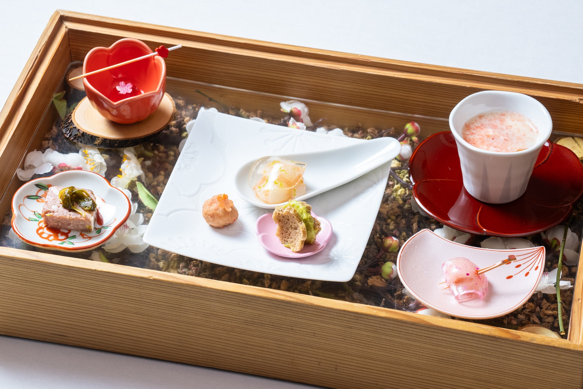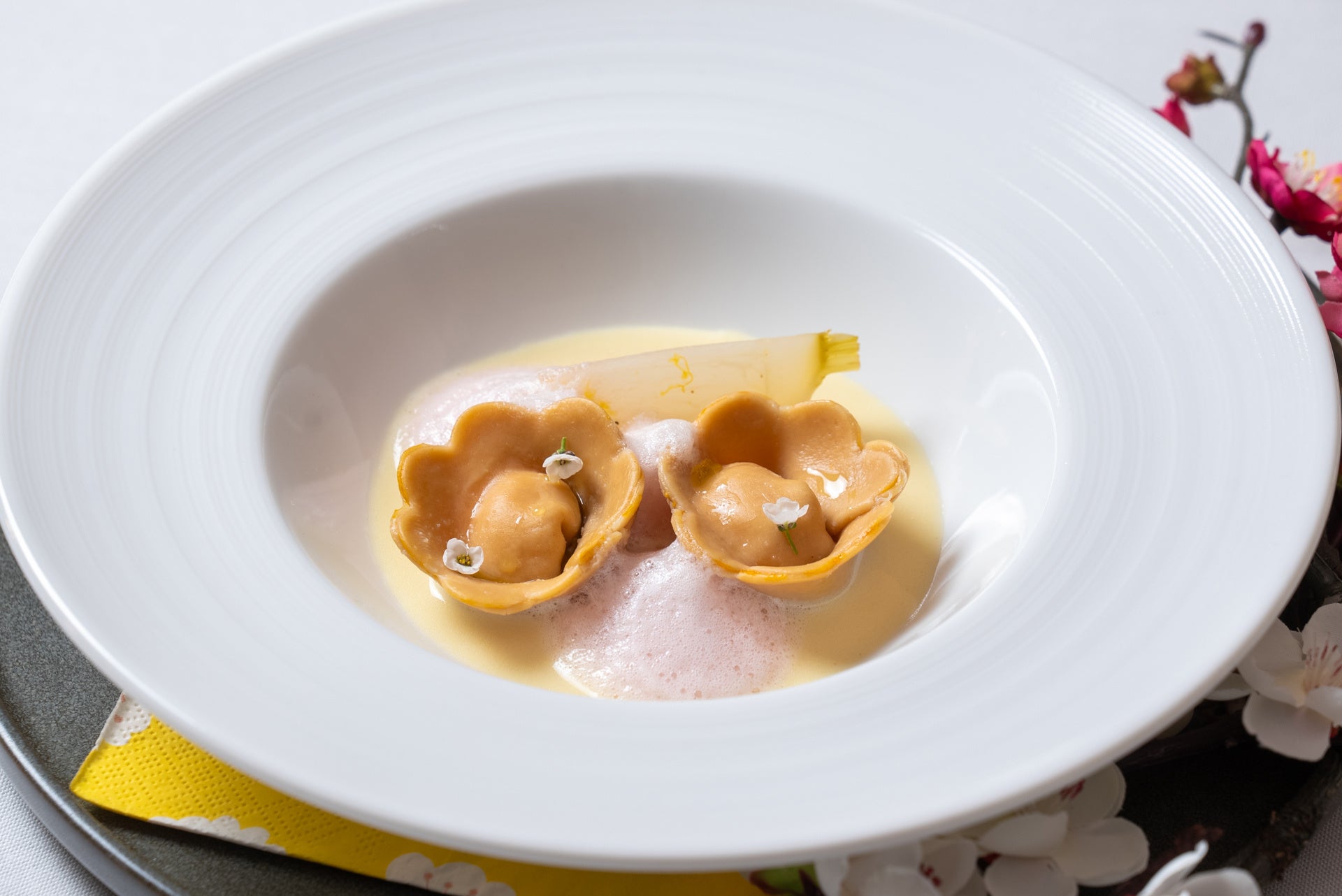梅の花をイメージしたラヴィオリ生地に、梅の香る泡状のソースが心地よく感じられるように仕上げています。