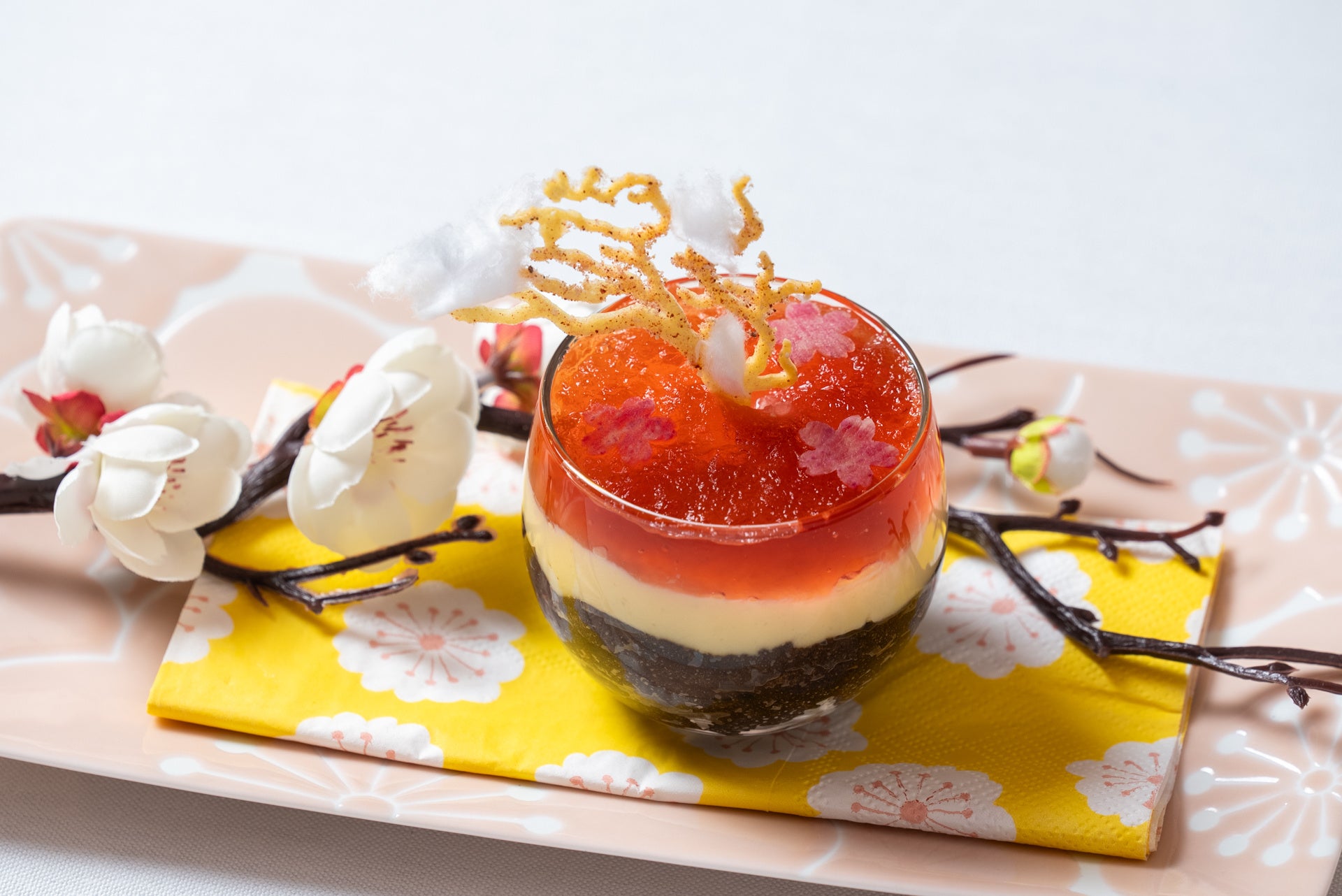 梅の盆栽をイメージしたパフェ。梅の盆栽をイメージしたパフェ。綿あめと木の形のチュイルによって梅林に見立てています。3年熟成梅ムースと越生梅ゼリーを使った梅を贅沢に感じられる一品。