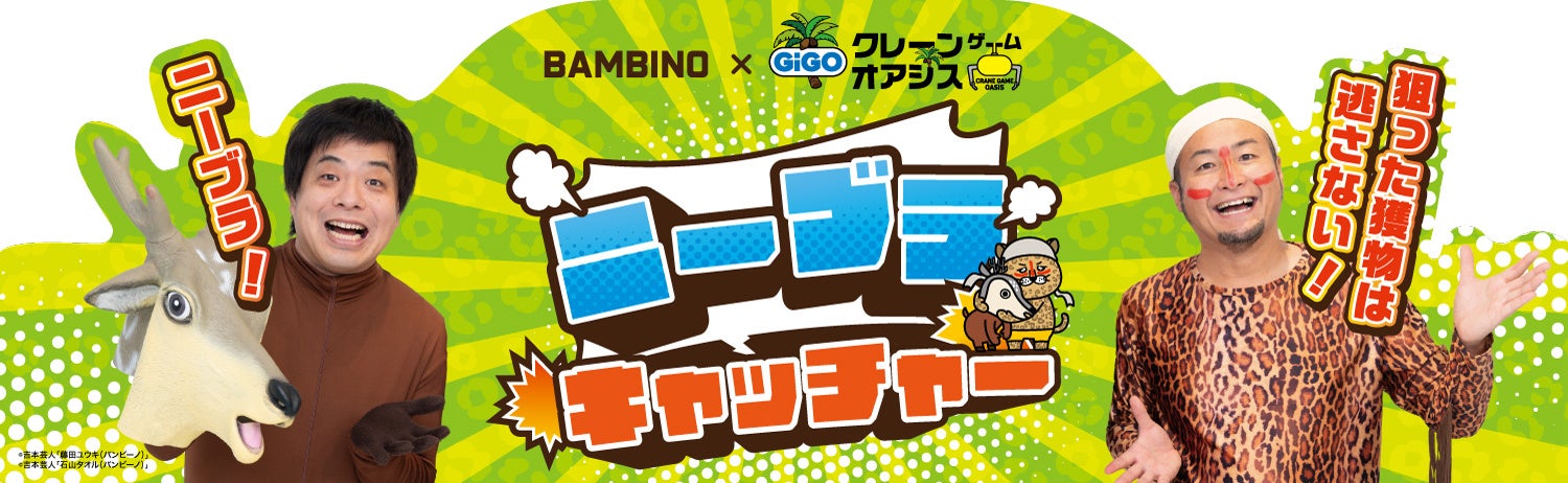 「GiGOクレーンゲームオアシス ワンズモール」をはじめ、全国の「GiGOクレーンゲームオアシス」4店舗でお笑い芸人「バンビーノ」のコラボクレーンゲームを展開します。「バンビーノ」おなじみのネタ「二―ブラ」にちなんだクレーンゲームや、「バンビーノ」のサイン入り等身大パネルも各店に登場します。