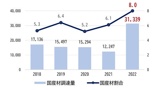 〈 大東建託の国産材調達量(㎥)/国産材割合推移 〉