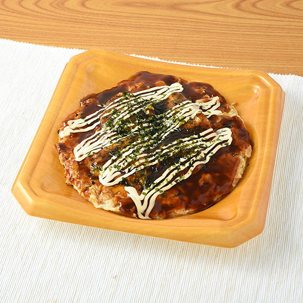 【内容】昆布だしを効かせた生地に、具材とえび粉、いか粉を加えてふっくらと焼き上げました。紅しょうがが味のアクセントです。唐辛子とビーフエキスを加えたソースで、スパイシーさを感じる仕立てにしました。